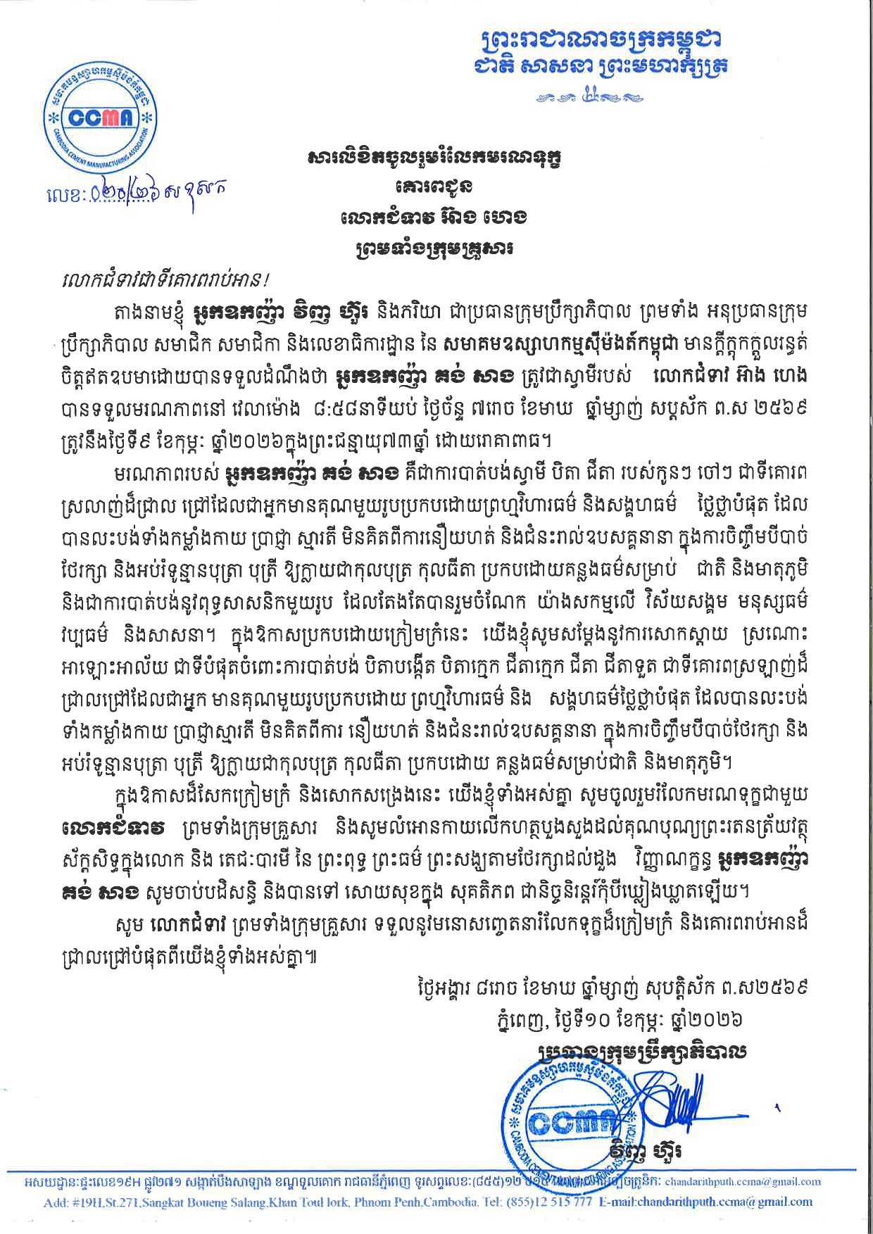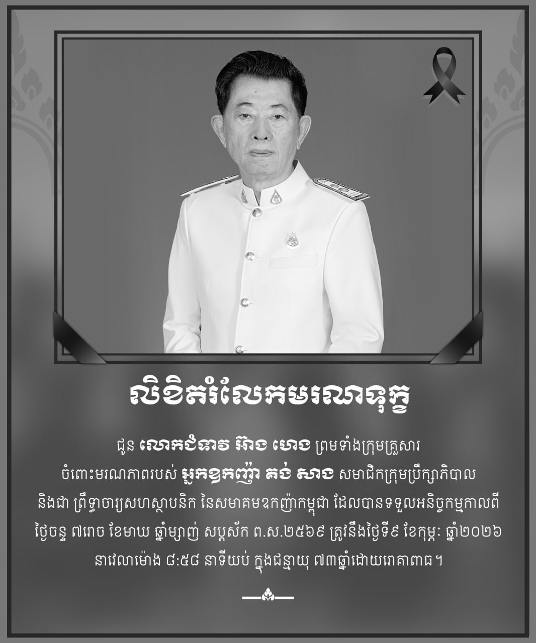 (ភ្នំពេញ)៖ អ្នកឧកញ៉ា វិញ ហ៊ួរ ប្រធានក្រុមប្រឹក្សាភិបាល នៃសមាគមឧស្សាហកម្មស៊ីម៉ងត៍កម្ពុជា បានផ្ញើសារលិខិតចូលរួមរំលែកមរណទុក្ខជូន លោកស្រី អ៊ាង ហេង ព្រមទាំងក្រុមគ្រួសារ ចំពោះមរណភាព អ្នកឧកញ៉ា គង់ សាង ត្រូវជាស្វាមីរបស់លោកស្រី កាលពីថ្ងៃទី៩ ខែកុម្ភៈ ឆ្នាំ២០២៦ ក្នុងព្រះជន្មាយុ ៧៣ ឆ្នាំ ដោយរោគាពាធ។