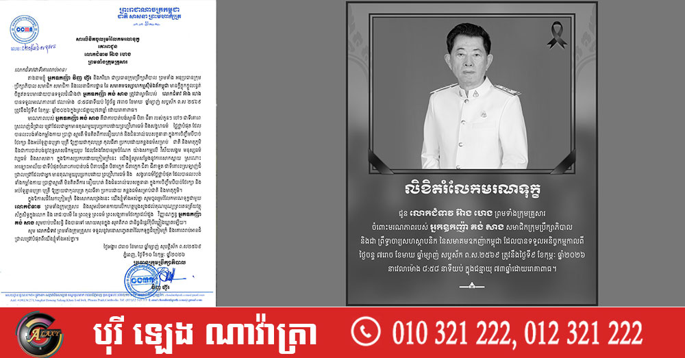 អ្នកឧកញ៉ា វិញ ហ៊ួរ ផ្ញើសារលិខិតចូលរួមរំលែកមរណទុក្ខ ចំពោះមរណភាព អ្នកឧកញ៉ា គង់ សាង