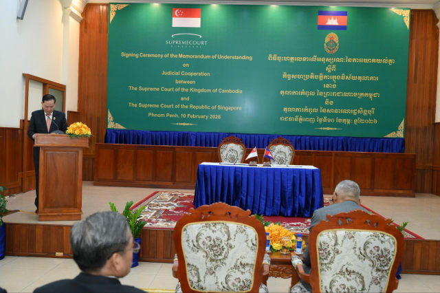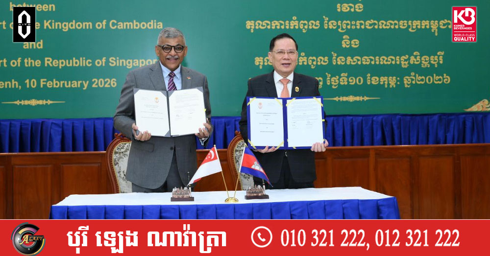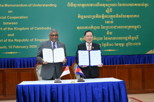 (ភ្នំពេញ)៖ លោក ជីវ កេង ប្រធានតុលាការកំពូលកម្ពុជា និងលោក ស៊ុនដារ៉េស មេណុន (SUNDARESH MENON) ប្រធានតុលាការកំពូលសិង្ហបុរី បានចុះអនុស្សរណៈ នៃការយោគយល់គ្នា (MOU) ស្តីពីកិច្ចសហប្រតិបត្តិការ ក្នុងវិស័យតុលាការ នាព្រឹកថ្ងៃអង្គារ ទី១០ ខែកុម្ភៈ ឆ្នាំ២០២៦។