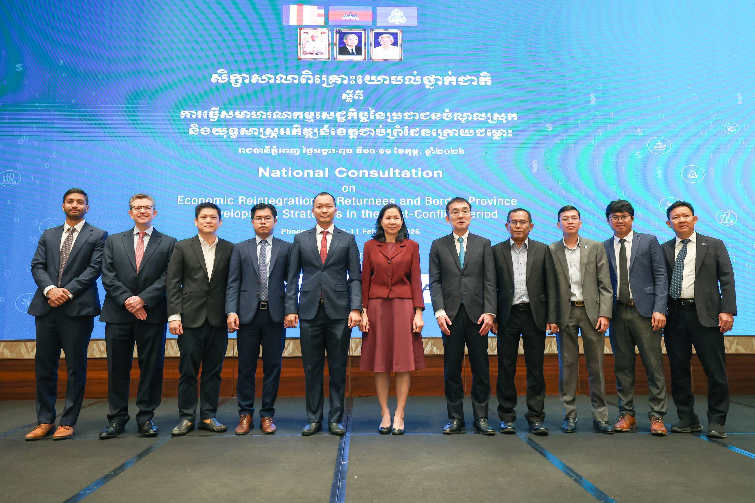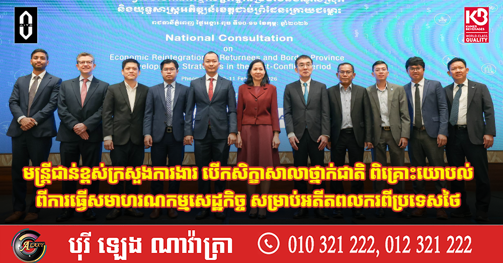 (ភ្នំពេញ)៖ លោក គួច សុមាន រដ្ឋលេខាធិការ តំណាងដ៏ខ្ពង់ខ្ពស់របស់លោក ហេង សួរ រដ្ឋមន្ត្រីក្រសួងការងារ និងបណ្តុះបណ្តាលវិជ្ជាជីវៈ នៅថ្ងៃទី១០ ខែកុម្ភៈ ឆ្នាំ២០២៦ បានអញ្ជើញចូលរួមជាគណៈអធិបតី និងថ្លែងសុន្ទរកថាស្វាគមន៍ក្នុងពិធីបើក «សិក្ខាសាលាពិគ្រោះយោបល់ថ្នាក់ជាតិ ស្តីពីការធ្វើសមាហរណកម្មសេដ្ឋកិច្ចនៃប្រជាជនចំណូលស្រុក និងយុទ្ធសាស្ត្រអភិវឌ្ឍន៍ខេត្តជាប់ព្រំដែនក្រោយជម្លោះ» នៅសណ្ឋាគារ ហៃយ៉ាត់ រីជិនស៊ី ភ្នំពេញ ដោយមានការចូលរួមពីតំណាងស្ថាប័នពាក់ព័ន្ធជាច្រើនរូប។
