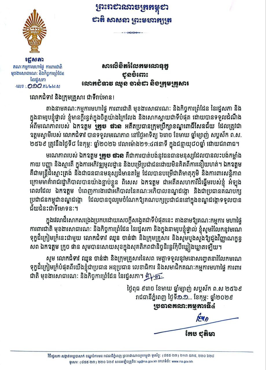 (ភ្នំពេញ)៖ លោក កែម ជុតិមា ប្រធានគណៈកម្មការមហាផ្ទៃ ការពារជាតិ មុខងារសាធារណៈ និងកិច្ចការព្រំដែន នៃរដ្ឋសភា បានសម្ដែងក្តីរន្ធត់ក្នុងចិត្តយ៉ាងក្រៃលែង និងសោកស្តាយជាទីបំផុត ដោយបានទទួលដំណឹងអំពីមរណភាពរបស់លោក ក្រូច ផាន អតីតប្រធានក្រុមប្រឹក្សាខណ្ឌពោធិ៍សែនជ័យ ដែលត្រូវជាឧត្តមស្វាមីរបស់លោកស្រី ឈូន ចាន់ដា បានទទួលមរណភាពនៅថ្ងៃអាទិត្យ ៦រោច ខែមាឃ ឆ្នាំម្សាញ់ សប្តស័ក ព.ស. ២៥៦៩ ត្រូវនឹងថ្ងៃទី៨ ខែកុម្ភៈ ឆ្នាំ២០២៦ វេលាម៉ោង២១:៤៧នាទី ក្នុងជន្មាយុ៨០ឆ្នាំ ដោយជរាពាធ។