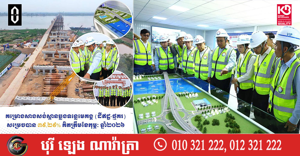 (កណ្តាល)៖ លោក ប៉េង ពោធិ៍នា រដ្ឋមន្រ្តីក្រសួងសាធារណការ និងដឹកជញ្ជូន នាព្រឹកថ្ងៃទី១១ ខែកុម្ភៈ ឆ្នាំ២០២៦នេះ បានអញ្ជើញដឹកនាំគណៈប្រតិភូ ចុះពិនិត្យវឌ្ឍនភាពការងារគម្រោងសាងសង់ស្ពានឆ្លងទន្លេមេគង្គ (ដីឥដ្ឋ-ថ្មគរ) ដែលស្ថិតនៅឃុំដីឥដ្ឋ ស្រុកកៀនស្វាយ និងឃុំថ្មគរ ស្រុកល្វាឯម ខេត្តកណ្តាល, គម្រោងសាងសង់ស្ពានឆ្លងទន្លេមេគង្គនេះ សម្រេចបាន ៣៩,២៩% គិតត្រឹមខែកុម្ភៈ ឆ្នាំ២០២៦នេះ។