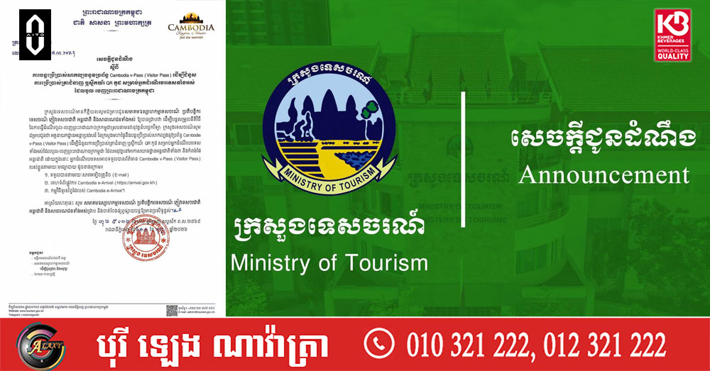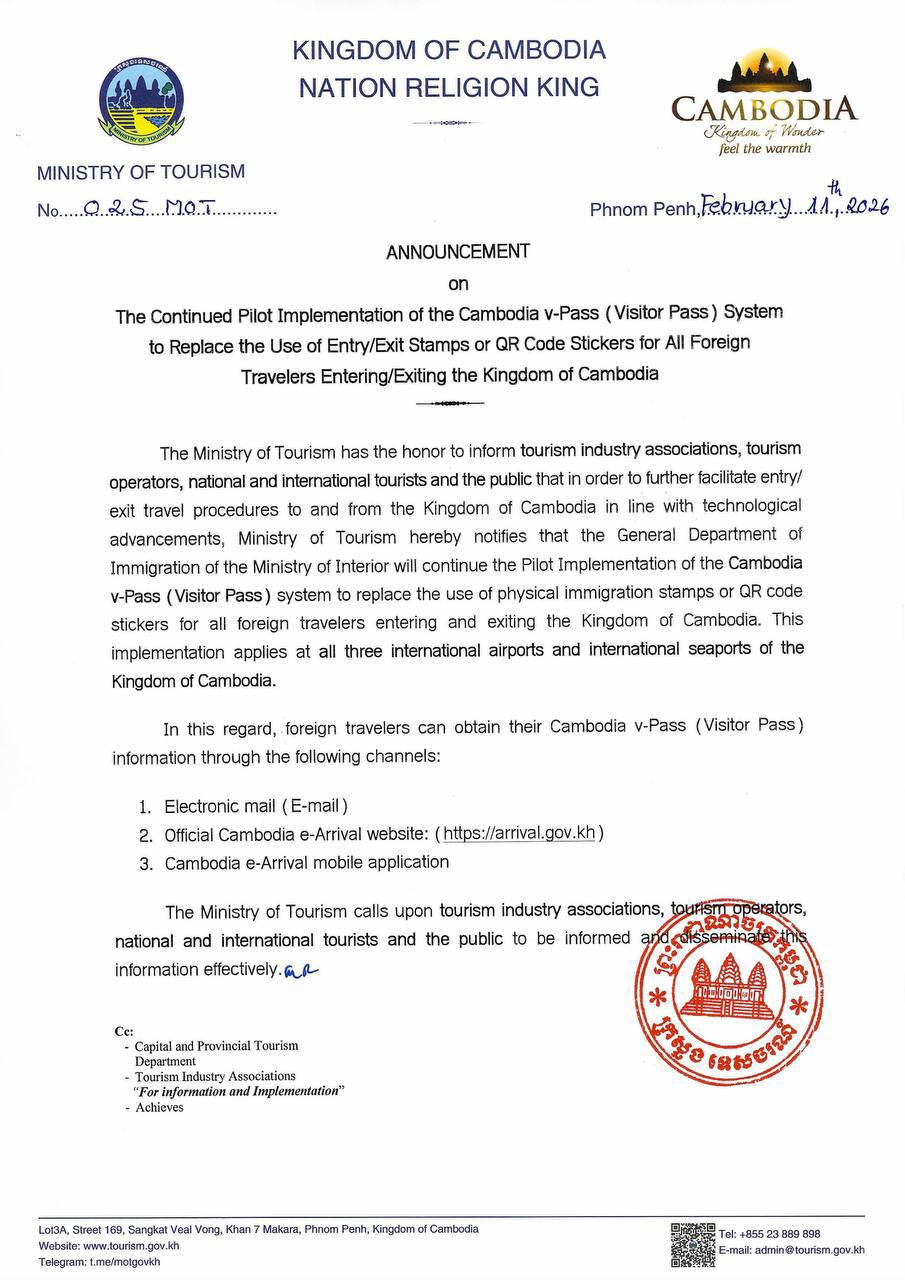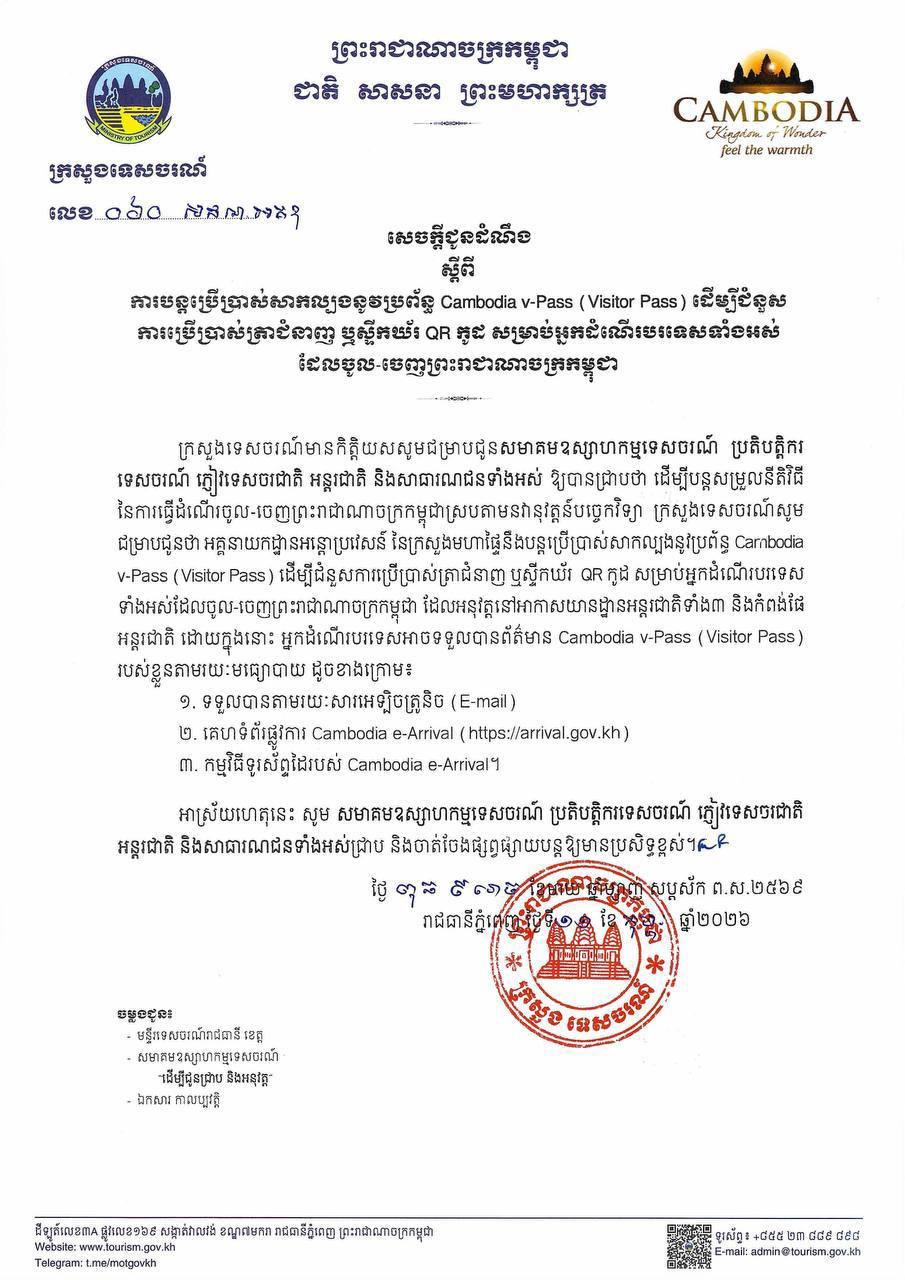 (ភ្នំពេញ)៖ ក្រសួងទេសចរណ៍ នៅថ្ងៃទី១១ ខែកុម្ភៈ ឆ្នាំ២០២៦នេះ បានចេញសេចក្តីជូនដំណឹង ស្តីពីការបន្តប្រើប្រាស់សាកល្បងនូវប្រព័ន្ធ Cambodia v-Pass (Visitor Pass) ដើម្បីជំនួសការប្រើប្រាស់ ត្រាជំនាញ ឬស្ទីកឃ័រ QR កូដ សម្រាប់អ្នកដំណើរបរទេសទាំងអស់ដែលចូល-ចេញកម្ពុជា ដែលអនុវត្តនៅអាកាសយានដ្ឋានអន្តរជាតិទាំង៣ និងកំពង់ផែ អន្តរជាតិ ដោយក្នុងនោះ អ្នកដំណើរបរទេសអាចទទួលបានព័ត៌មាន Cambodia v-Pass (Visitor Pass) របស់ខ្លួនតាមរយៈមធ្យោបាយ ដូចខាងក្រោម៖