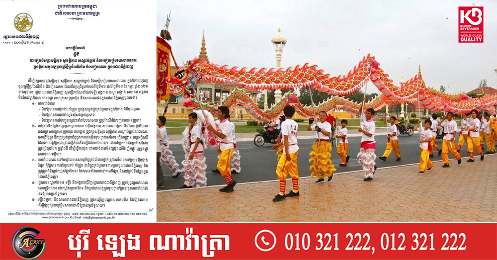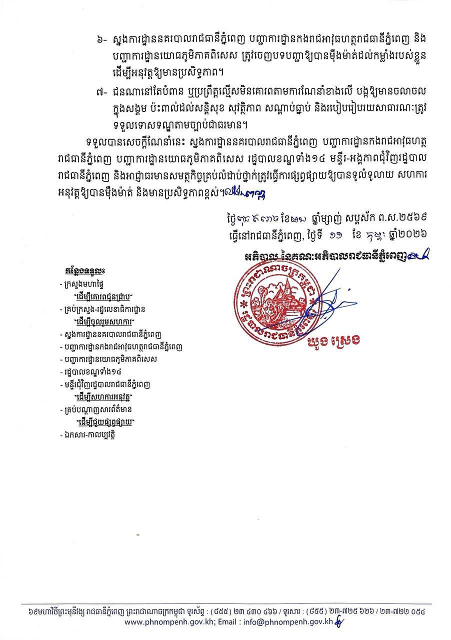 ដើម្បីរក្សាបាននូវសន្តិសុខ សុវត្ថិភាព សណ្តាប់ធ្នាប់ និងរបៀបរៀបរយសាធារណៈ ក្នុងឱកាសបុណ្យ ចូលឆ្នាំថ្មីប្រពៃណីចិន និងវៀតណាម ដែលនឹងប្រព្រឹត្តទៅចាប់ពីថ្ងៃទី១៦ ដល់ថ្ងៃទី១៩ ខែកុម្ភៈ ឆ្នាំ២០២៦ ខាងមុខនេះ រដ្ឋបាលរាជធានីភ្នំពេញ សូមធ្វើការណែនាំដល់មន្ទីរ អង្គភាព ខណ្ឌ សង្កាត់ សមាគម អង្គការ មិនមែនរដ្ឋាភិបាល រោងចក្រ សហគ្រាស ក្រុមហ៊ុន និងសាធារណជនក្នុងរាជធានីភ្នំពេញដូចតទៅ៖
