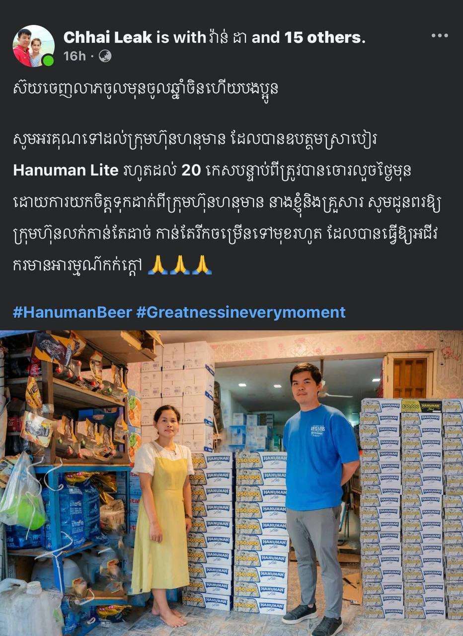បងស្រីជាម្ចាស់អជីវកម្មបានសម្តែងចិត្តត្រេកអរ និងបង្ហាញភាពកក់ក្តៅដែលទទួលបានការយកចិត្តទុកពីក្រុមហ៊ុន ហនុមាន ផ្ទាល់ដែលតែងតែគិតគូពីអតិថិជនរបស់ខ្លួន។បងស្រីក៏បានបង្ហោះសារជូនពរ និងថ្លែងអំណរគុណទៅកាន់ក្រុមហ៊ុនហនុមាន ដែលមានខ្លឹមសារដូចខាងក្រោមថា៖ «ស៊យចេញលាភចូលមុនចូលឆ្នាំចិនហើយបងប្អូន សូមអរគុណទៅដល់ក្រុមហ៊ុនហនុមាន ដែលបានឧបត្ថមស្រាបៀរ Hanuman Lite រហូតដល់២០កេស បន្ទាប់ពីត្រូវបានចោរលួចថ្ងៃមុន ដោយការយកចិត្តទុកដាក់ពីក្រុមហ៊ុនហនុមាន នាងខ្ញុំនិងគ្រួសារ សូមជូនពរឱ្យក្រុមហ៊ុនលក់កាន់តែដាច់ កាន់តែរីកចម្រើនទៅមុខរហូត ដែលបានធ្វើឱ្យអជីវករមានអារម្មណ៍កក់ក្តៅ»។