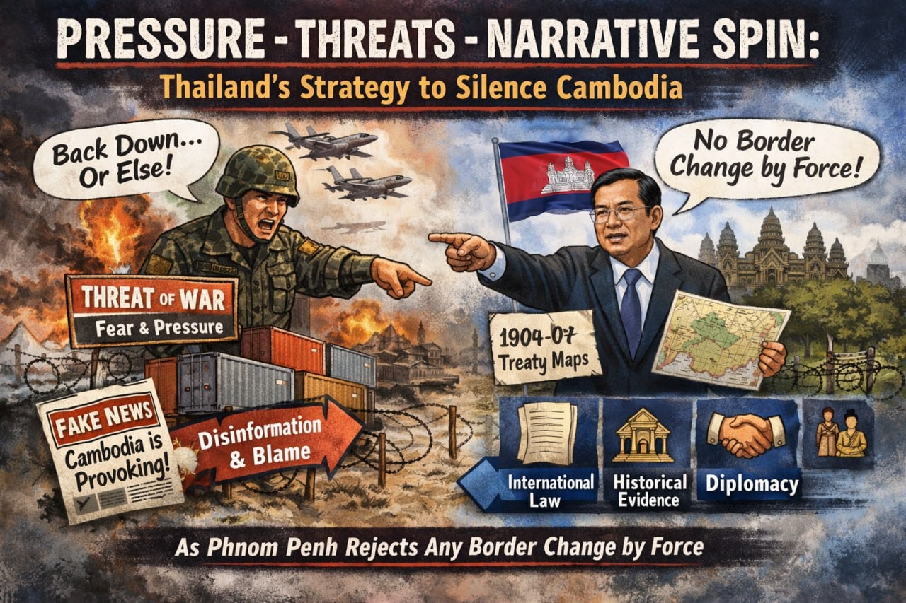 សេចក្តីសន្និដ្ឋាន៖ យុទ្ធសាស្ត្រគំរាម និងព័ត៌មានក្លែងក្លាយ មិនមែនមានគោលបំណងត្រឹមបង្កអារម្មណ៍ភ័យប៉ុណ្ណោះទេ ប៉ុន្តែជាការប៉ុនប៉ងធ្វើឲ្យកម្ពុជាស្ងៀមស្ងាត់ និងឲ្យ «ស្ថានភាពលើដី» ក្លាយជាការពិតថ្មីដោយបណ្តោះអាសន្ន។ ប៉ុន្តែស្ថានភាពបណ្តោះអាសន្ន មិនអាចជំនួសស្ថានភាពតាមច្បាប់បានឡើយ។ កម្លាំងអាចបង្កសម្ពាធបាន ប៉ុន្តែមិនអាចបង្កើតសិទ្ធិស្របច្បាប់បានទេ។