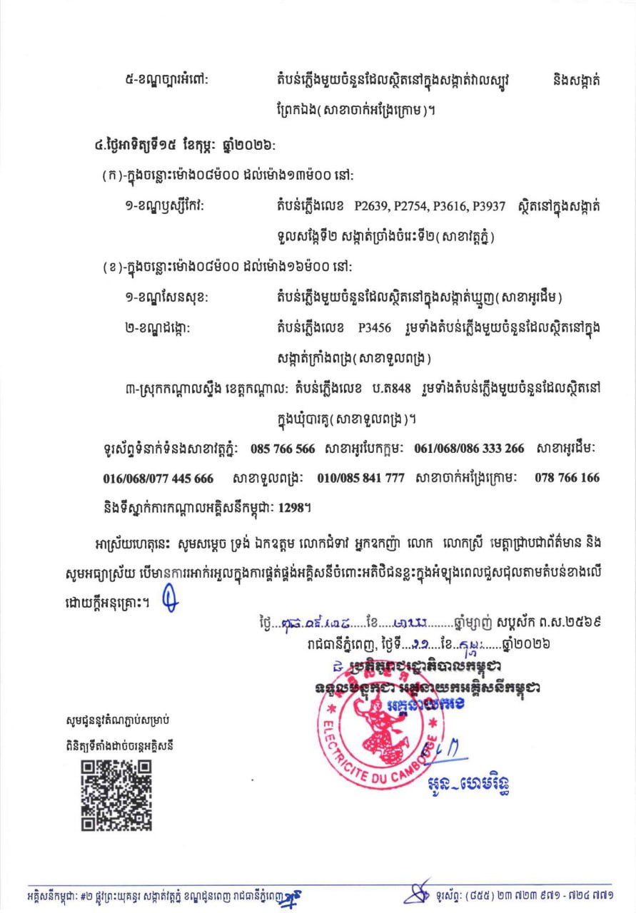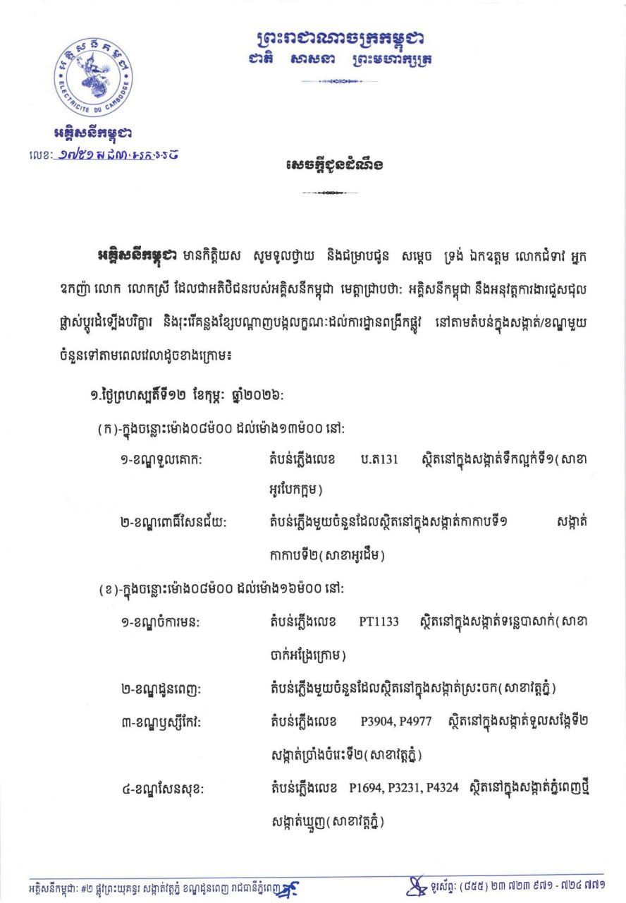 (ភ្នំពេញ)៖ អគ្គិសនីកម្ពុជា(EDC) បានចេញសេចក្តីជូនដំណឹងស្តីពីការអនុវត្តការងារជួសជុល ផ្លាស់ប្តូរដំឡើងបរិក្ខារនានា និងរុះរើគន្លងខ្សែបណ្តាញ អគ្គិសនីរបស់អគ្គិសនីកម្ពុជា ដើម្បីបង្កលក្ខណៈងាយស្រួលដល់ការដ្ឋានពង្រីកផ្លូវ នៅថ្ងៃទី១២ ខែកុម្ភៈ ឆ្នាំ២០២៦ ដល់ថ្ងៃទី១៥ ខែកុម្ភៈ ឆ្នាំ២០២៦ នៅតំបន់មួយចំនួនទៅតាមពេលវេលា និងទីកន្លែងដូចសេចក្តីជូនដំណឹងលម្អិតខាងក្រោម។