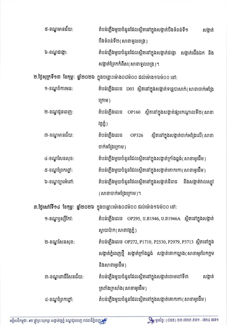 EDC ជូនដំណឹងពីការរអាក់រអួលចរន្តតាមតំបន់សង្កាត់ខណ្ឌមួយចំនួនចាប់ពីថ្ងៃនេះ ដល់ថ្ងៃទី១៥ ខែកុម្ភៈ ដើម្បីរុះរើគន្លងខ្សែបណ្តាញ ផ្លាស់ប្តូរ តម្លើងបរិក្ខារ ងាយស្រួលដល់ការដ្ឋានពង្រីកផ្លូវ