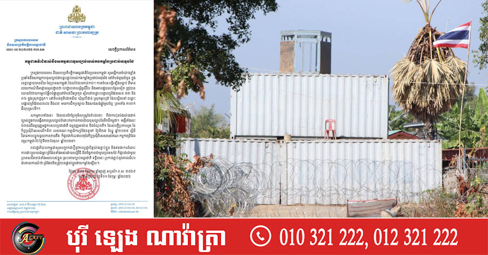 (ភ្នំពេញ)៖ ក្រសួងការបរទេស និងសហប្រតិបត្តិការអន្តរជាតិកម្ពុជា នៅថ្ងៃទី១១ ខែកុម្ភៈ ឆ្នាំ២០២៦ បានចេញលិខិតតវ៉ាយ៉ាងខ្លាំង ប្រឆាំងនឹងសកម្មភាពខុសច្បាប់ជាបន្តបន្ទាប់របស់កងកម្លាំងប្រដាប់អាវុធថៃ នៅតំបន់មួយចំនួន ក្នុងខេត្តបន្ទាយមានជ័យ ប្រទេសកម្ពុជា។