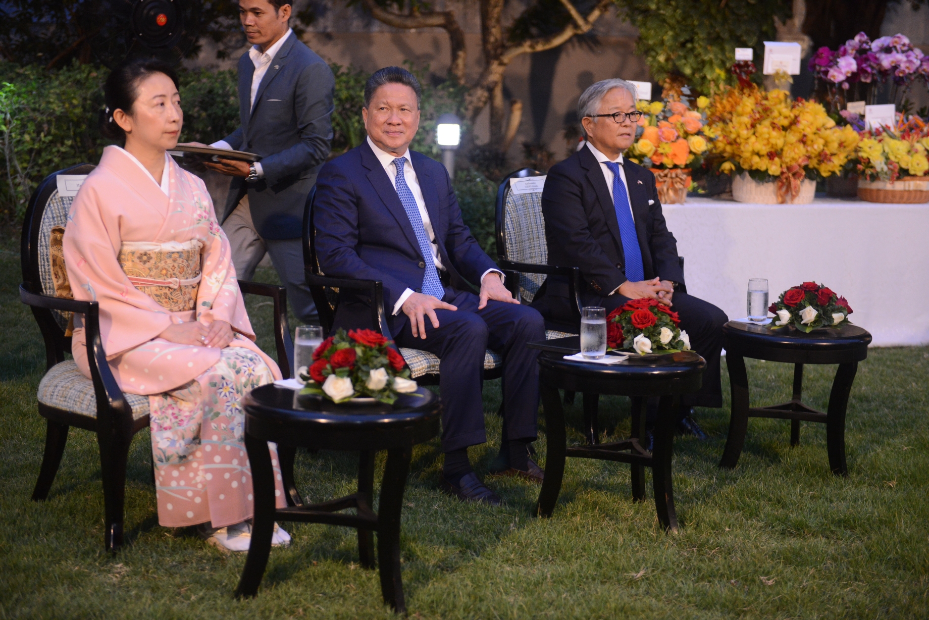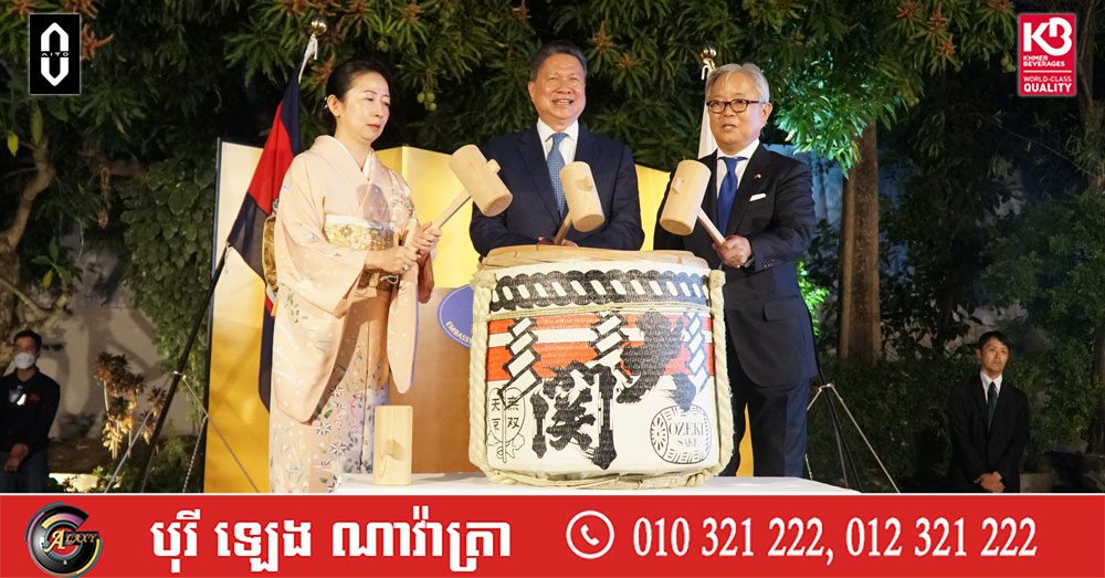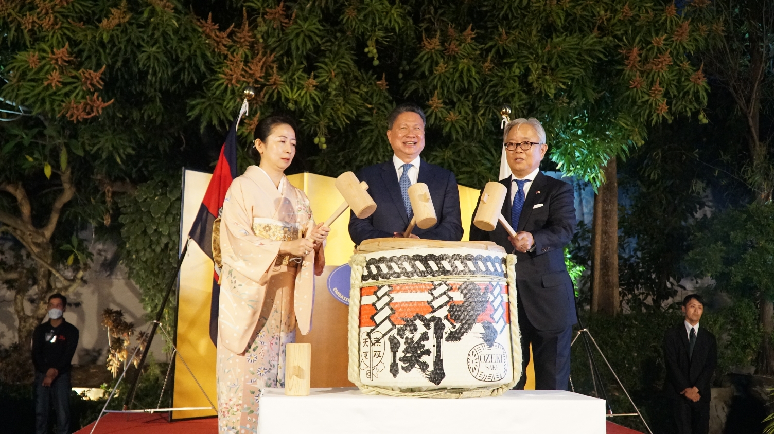 ក្នុងពិធីដ៏មហោឡារិកនេះ មានការបំបែកធុងស្រាសាកេដែលជាពិធីប្រពៃណីជប៉ុនដែលហៅថា «កាហ្គាមិ វ៉ារី» ដើម្បីអបអរសាទរពិធីចម្រើនព្រះជន្មគម្រប់ ៦៦ព្រះវស្សា របស់ព្រះករុណា ព្រះចៅអធិរាជជប៉ុន ណារុហ៊ីតុ (NARUHITO) និងមិត្តភាពដ៏យូរអង្វែងរវាងជប៉ុន និងកម្ពុជា។
