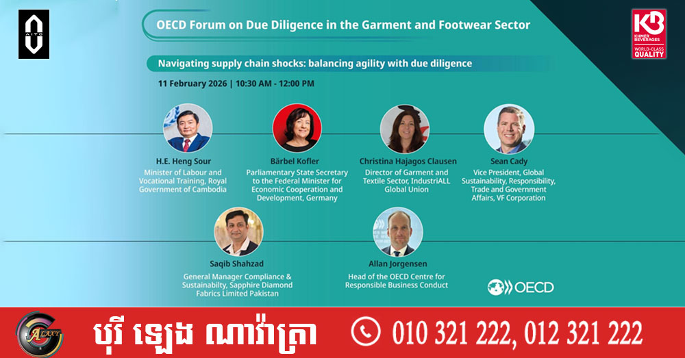 (ប៉ារីស)៖ នៅថ្ងៃទី១១-១២ ខែកុម្ភៈ ឆ្នាំ២០២៦ នេះ លោក ហេង សួរ រដ្ឋមន្ត្រីក្រសួងការងារ និងបណ្តុះបណ្តាលវិជ្ជាជីវៈ បានដឹកនាំគណៈប្រតិភូត្រីភាគីកម្ពុជាចូលរួមវេទិការបស់អង្គការសម្រាប់កិច្ចសហប្រតិបត្តិការ និងអភិវឌ្ឍន៍សេដ្ឋកិច្ច(OECD) ស្តីពីការត្រួតពិនិត្យអនុលោមភាពនៅក្នុងវិស័យកាត់ដេរ និងផលិតស្បែកជើង ដែលប្រព្រឹត្តទៅនៅទីស្នាក់ការកណ្តាលអង្គការ OECD ក្នុងទីក្រុងប៉ារីស ប្រទេសបារាំង។