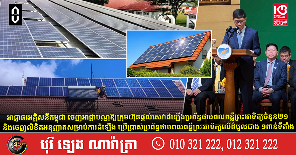 អាជ្ញាធរអគ្គិសនីកម្ពុជា ចេញអាជ្ញាបណ្ណឱ្យក្រុមហ៊ុនផ្តល់សេវាដំឡើងប្រព័ន្ធថាមពលពន្លឺព្រះអាទិត្យចំនួន២១ និងចេញលិខិតអនុញ្ញាតសម្រាប់ការដំឡើង ប្រើប្រាស់ប្រព័ន្ធថាមពលពន្លឺព្រះអាទិត្យលើដំបូលជាង ១ពាន់ទីតាំង