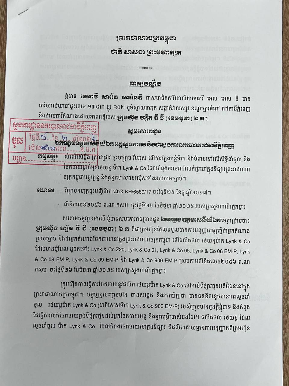 ក្រុមហ៊ុនបានធ្វើការចែកចាយនូវផលិតរថយន្តម៉ាក Lynk & Co ទៅកាន់ទីផ្សារជូនអតិថិជននៅក្នុងប្រទេសកម្ពុជា។ បច្ចុប្បន្ននេះ ក្រុមហ៊ុន បានសង្កេត និងរកឃើញថា មានជនខិលខូច បានការលួចនាំចូលរថយន្តម៉ាក Lynk & Co (ជាពិសេសម៉ាក Lynk & Co 900 EM-P) របស់ក្រុមហ៊ុនកូនក្តីខ្ញុំបាទ និងកំពុងតែធ្វើការលក់ចែកចាយក្នុងទីផ្សារ ជូនដល់អ្នកចែកចាយបន្ត និងអ្នកប្រើប្រាស់ផងដែរ។
