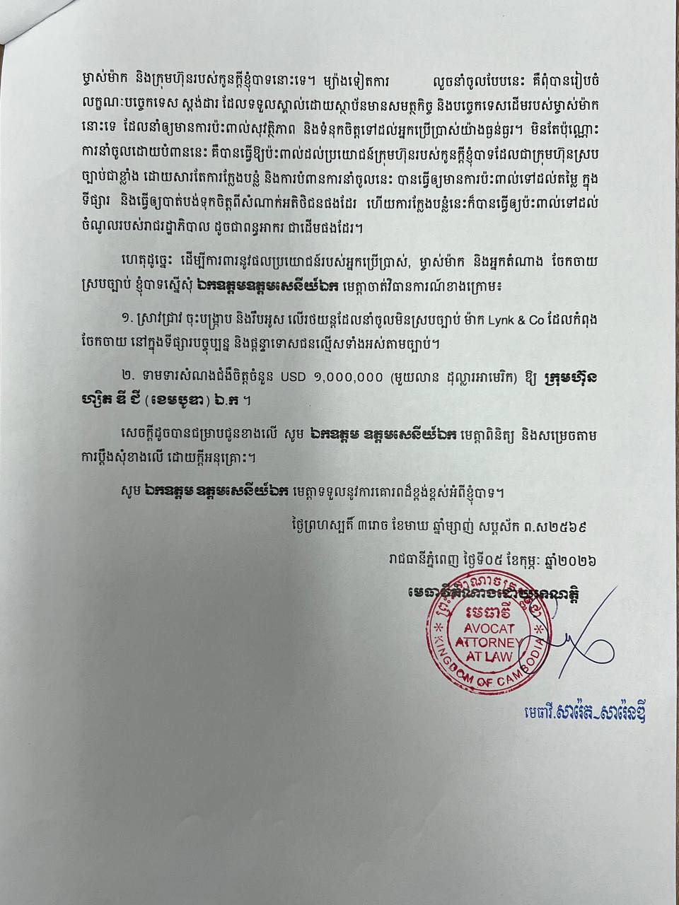 កាលពីថ្ងៃទី១០ ខែកុម្ភៈ ឆ្នាំ២០២៦ ក្រុមហ៊ុនបានដាក់ពាក្យបណ្ដឹងទៅ ក្រុមហ៊ុន V8 TECHNOLOGY LTD លើការក្លែងបន្លំម៉ាក និងបំពានទៅលើសិទ្ធិនាំចូល និង ចែកចាយរថយន្ត ម៉ាក Lynk & Co ដែលកំពុងចរាចរណ៍លក់ដូរនៅក្នុងទីផ្សារ ព្រះរាជាណាចក្រកម្ពុជាបច្ចុប្បន្ន និងផ្តន្ទាទោសជនល្មើសទាំងអស់តាមច្បាប់៕