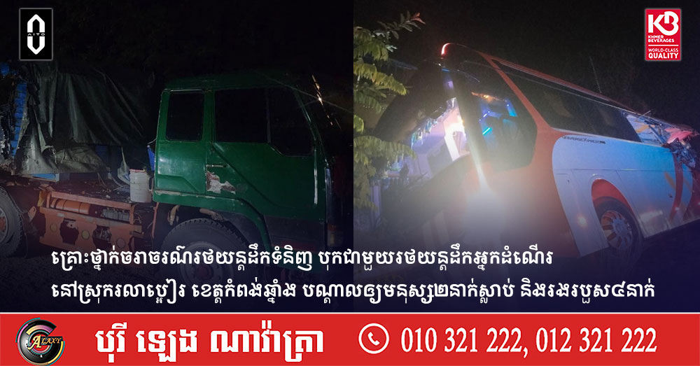 គ្រោះថ្នាក់ចរាចរណ៍រថយន្ដដឹកទំនិញ បុកជាមួយរថយន្ដដឹកអ្នកដំណើរ នៅស្រុករលាប្អៀរ ខេត្តកំពង់ឆ្នាំង បណ្ដាលឲ្យមនុស្ស២នាក់ស្លាប់ និងរងរបួស៤នាក់