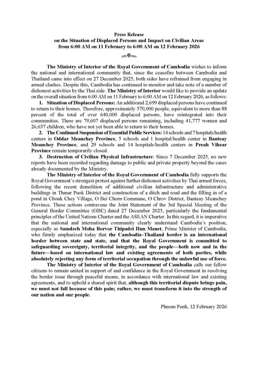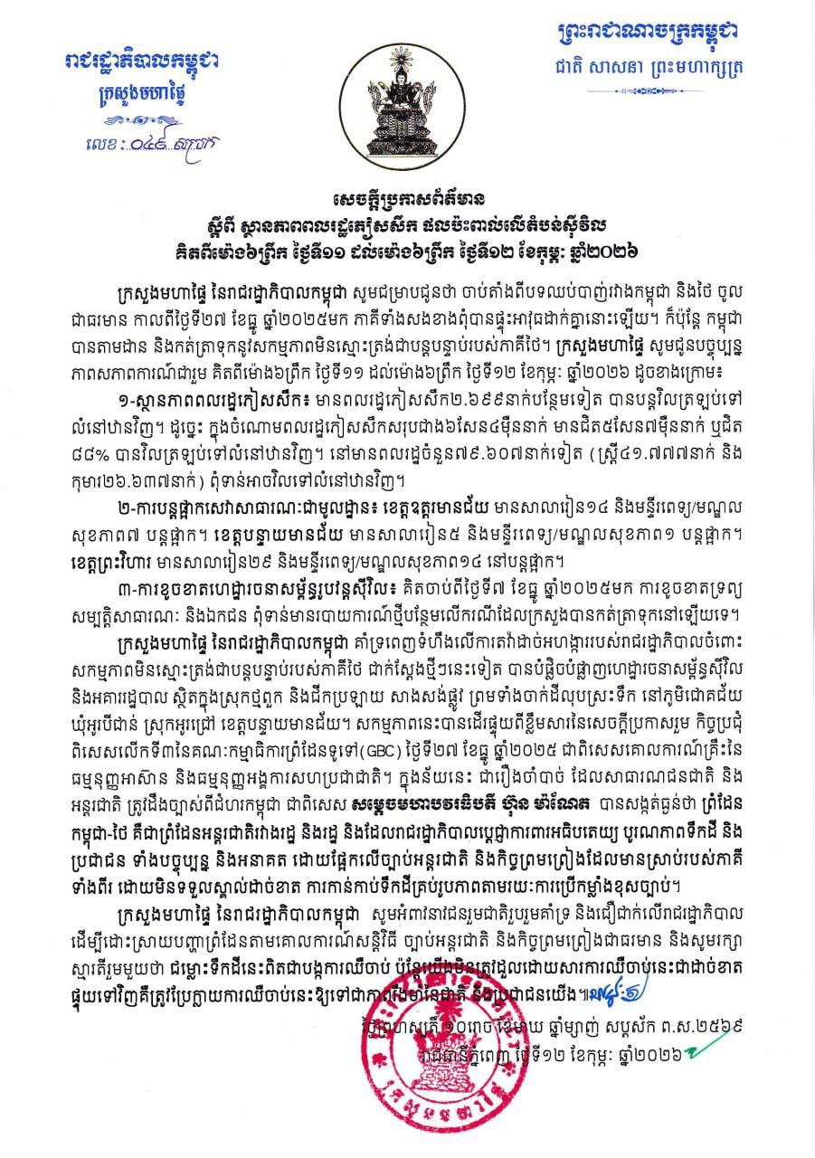 (ភ្នំពេញ)៖ ក្រសួងមហាផ្ទៃ នៅព្រឹកថ្ងៃទី១១ ខែកុម្ភៈ ឆ្នាំ២០២៦នេះ បានឲ្យដឹងថា គិតចាប់ពីម៉ោង៦ព្រឹក ថ្ងៃទី១១ ដល់ម៉ោង៦ព្រឹក ថ្ងៃទី១២ ខែកុម្ភៈ ឆ្នាំ២០២៦នេះ មានប្រជាពលរដ្ឋភៀសសឹក ២,៦៩៩នាក់ បានវិលត្រឡប់ទៅលំនៅឋានវិញ។ ដូច្នេះក្នុងចំណោមពលរដ្ឋភៀសសឹកសរុបជាង៦សែន៤ម៉ឺននាក់ មានជិត៥សែន៧ម៉ឺននាក់ ស្មើប្រមាណ៨៨ភាគរយ បានវិលត្រឡប់ទៅលំនៅឋានវិញ។