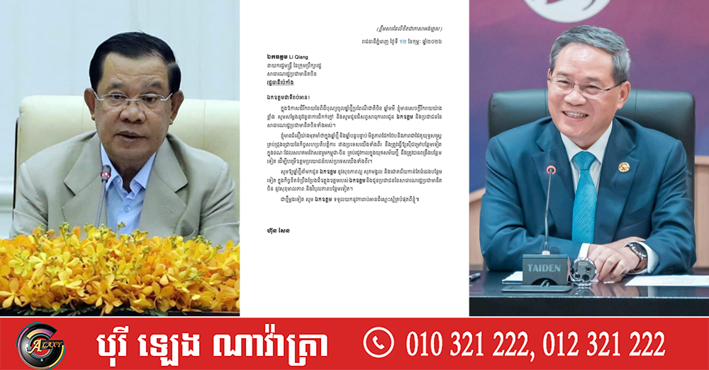 (ភ្នំពេញ)៖ សម្តេចតេជោ ហ៊ុន សែន ប្រធានព្រឹទ្ធសភាកម្ពុជា បានផ្ញើសារលិខិតជូនពរ លោក Li Qiang នាយករដ្ឋមន្ត្រី នៃក្រុមប្រឹក្សារដ្ឋសាធារណរដ្ឋប្រជាមានិតចិន ក្នុងឱកាសពិធីបុណ្យចូលឆ្នាំថ្មីប្រពៃណីជាតិចិន។