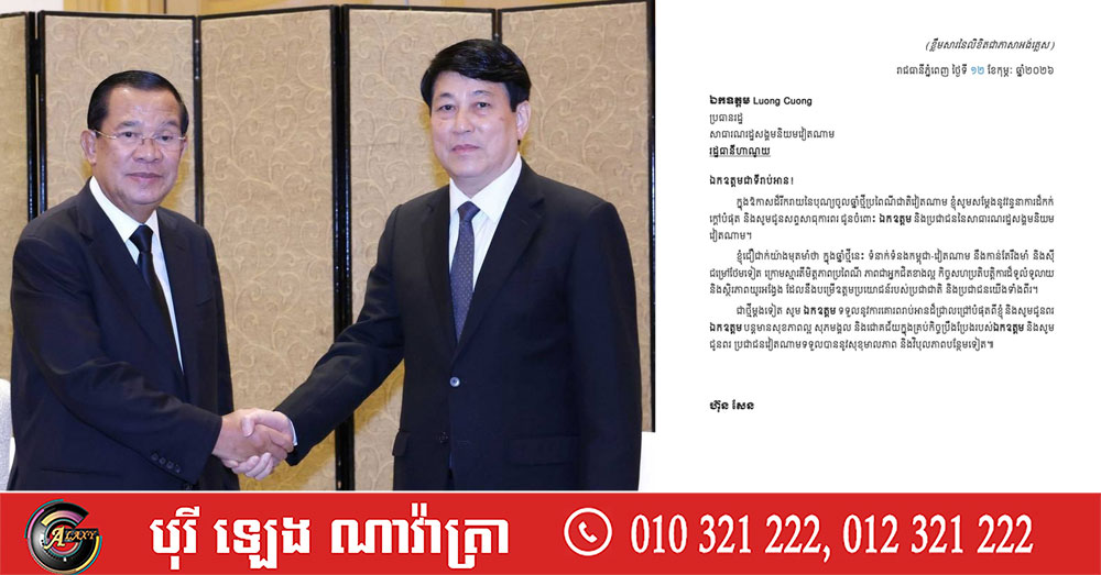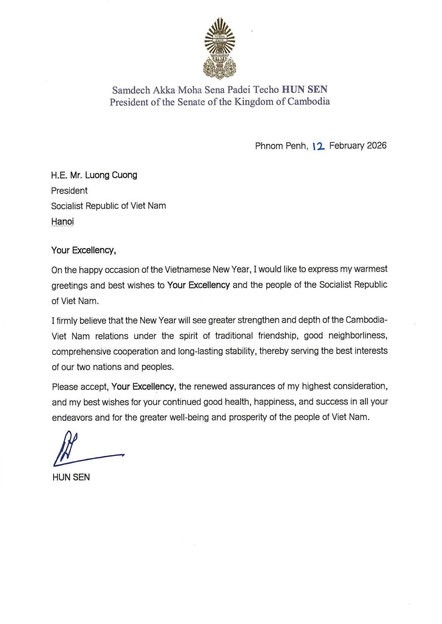 (ភ្នំពេញ)៖ សម្តេចតេជោ ហ៊ុន សែន ប្រធានព្រឹទ្ធសភាកម្ពុជា បានផ្ញើសារលិខិតជូនពរលោក Luong Cuong ប្រធានរដ្ឋសាធារណរដ្ឋសង្គមនិយមវៀតណាម ក្នុងឱកាសពិធីបុណ្យចូលឆ្នាំថ្មីប្រពៃណីជាតិវៀតណាម។