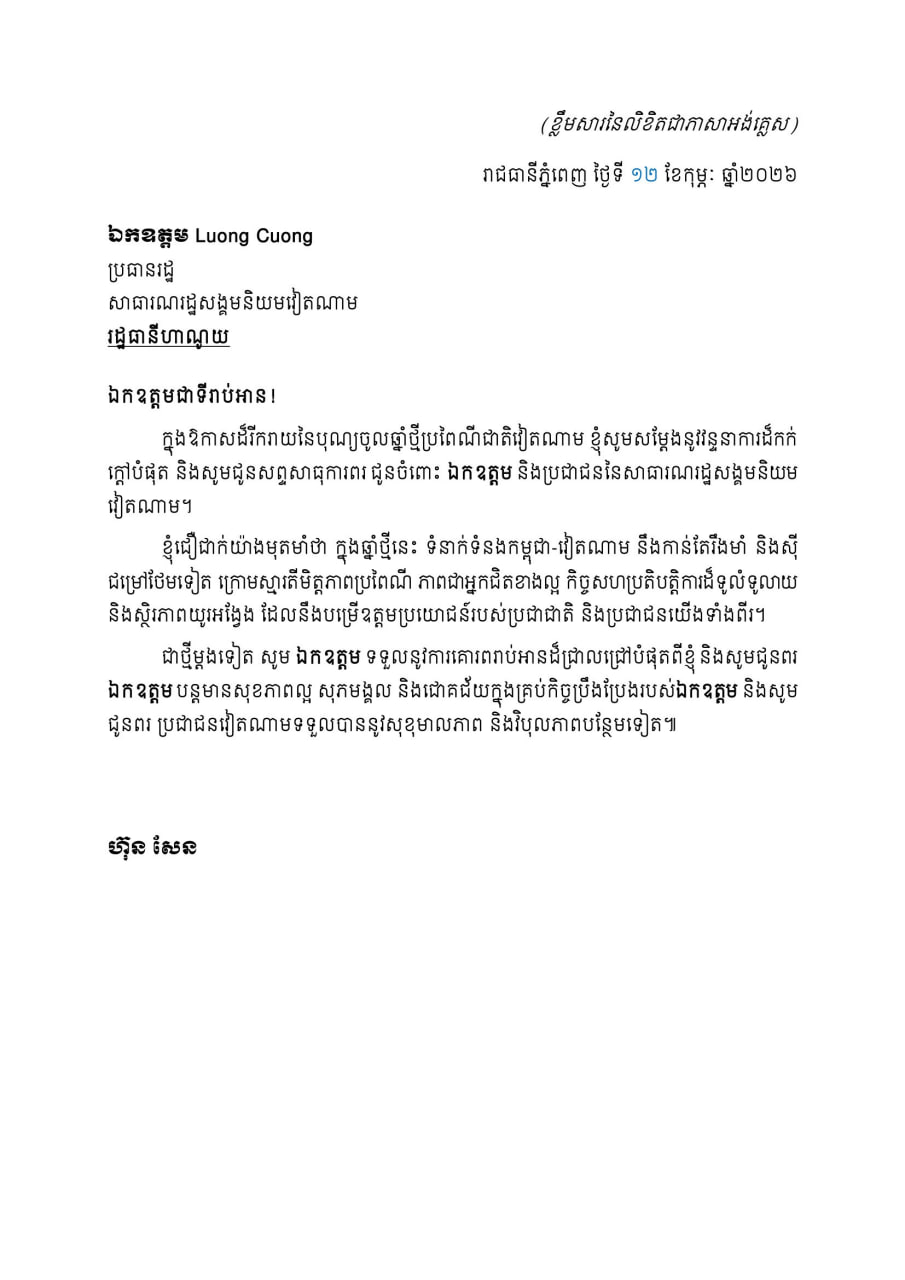 ជាថ្មីម្តងទៀត សូម ឯកឧត្តម ទទួលនូវការគោរពរាប់អានដ៏ជ្រាលជ្រៅបំផុតពីខ្ញុំ និងសូមជូនពរ ឯកឧត្តម បន្តមានសុខភាពល្អ សុភមង្គល និងជោគជ័យក្នុងគ្រប់កិច្ចប្រឹងប្រែងរបស់ឯកឧត្តម និងសូមជូនពរប្រជាជនវៀតណាមទទួលបាននូវសុខុមាលភាព និងវិបុលភាពបន្ថែមទៀត»៕