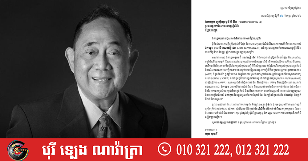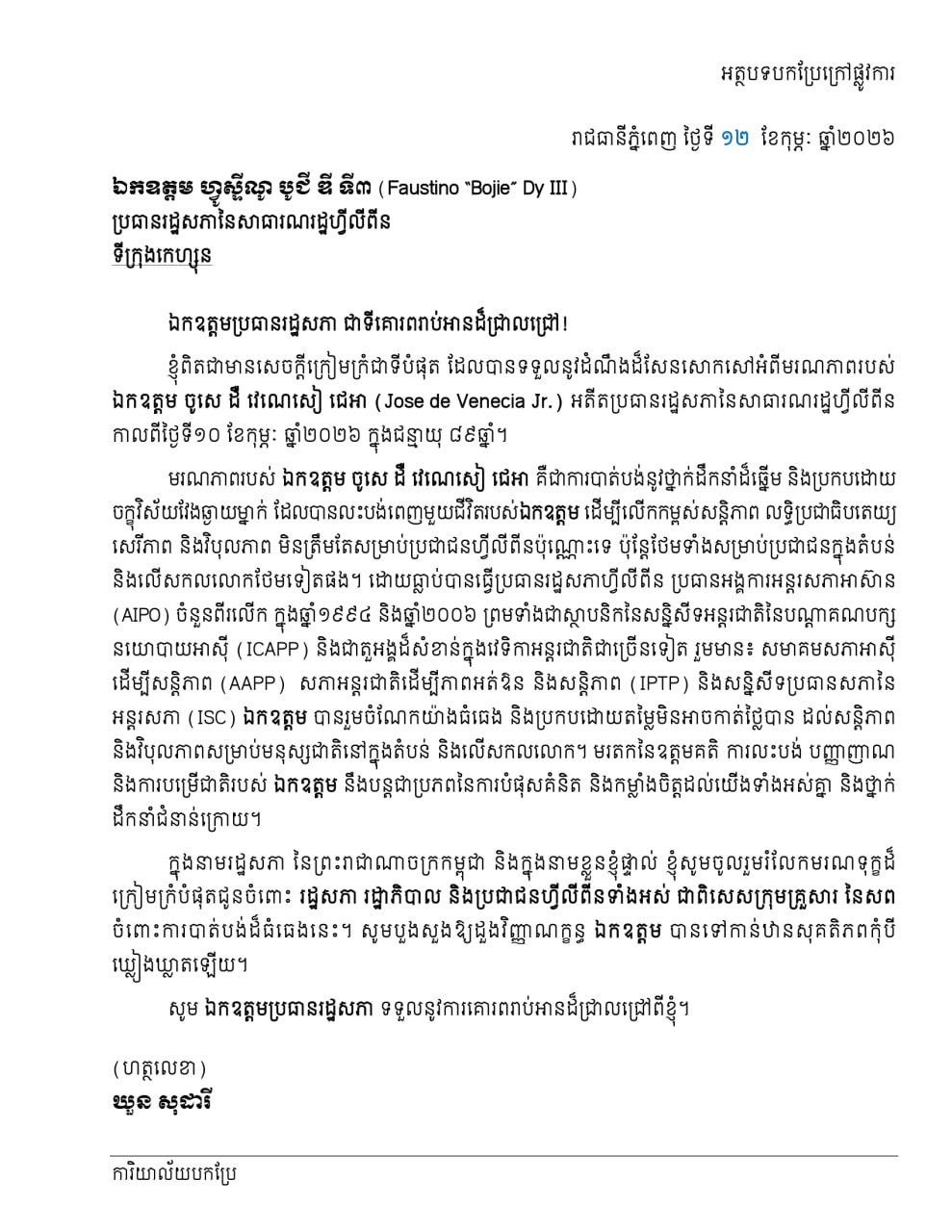 (ភ្នំពេញ)៖ សម្ដេចមហារដ្ឋសភាធិការធិបតី ឃួន សុដារី ប្រធានរដ្ឋសភានៃព្រះរាជាណាចក្រកម្ពុជា នៅថ្ងៃទី១២ ខែកុម្ភៈ ឆ្នាំ២០២៦ បានផ្ញើលិខិតរំលែកទុក្ខដ៏ក្រៀមក្រំអំពីមរណភាពរបស់ លោក ចូសេ ដឺ វេណេសៀ ជេអា (Jose de Venecia Jr.) អតីតប្រធានរដ្ឋសភានៃសាធារណរដ្ឋហ្វីលីពីន កាលពីថ្ងៃទី១០ ខែកុម្ភៈ ឆ្នាំ២០២៦ ក្នុងជន្មាយុ ៨៩ឆ្នាំ តាមរយៈ លោក ហ្វូស្ទីណូ បូជី ឌី ទី៣ (Faustino Bojie Dy III) ប្រធានរដ្ឋសភា នៃសាធារណរដ្ឋហ្វីលីពីន។