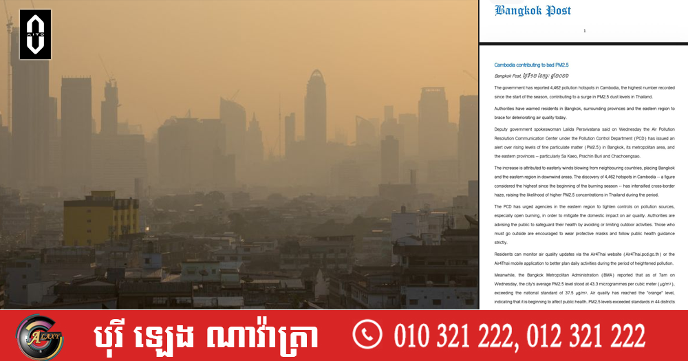 (ភ្នំពេញ)៖ ក្រុងបាងកក ប្រទេសថៃ ត្រូវបានរាយការណ៍ទទួលរងការវាយប្រហារដោយខ្យល់ពុល PM2.5 ក្នុងកម្រិតធ្ងន់ធ្ងរជារៀងរាល់ឆ្នាំ។ ខែធ្នូ ឆ្នាំ២០២៥ រហូតដល់ដើមខែកុម្ភៈ ឆ្នាំ២០២៦នេះ មានសេចក្តីរាយការណ៍ជាច្រើនពីការកើនឡើងកម្រិតខ្យល់ពុល PM2.5 នៅក្នុងក្រុងបាងកក ហើយសារក្រើនរំលឹកពីការប្រុងប្រយ័ត្នចំពោះផលប៉ះពាល់ផ្នែកសុខភាព ត្រូវបានផ្សព្វផ្សាយជាបន្តបន្ទាប់ទៅកាន់ប្រជាពលរដ្ឋរស់នៅក្រុងបាងកកផងដែរ។