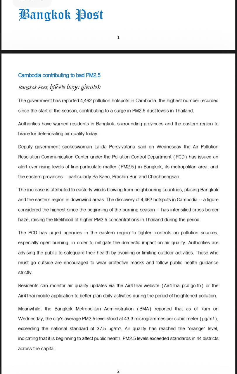 មិនខុសពីទម្លាប់នៃការចោទដ៏អាក្រក់ដូចនឹងរាល់ឆ្នាំដែរនោះ នៅថ្ងៃទី១២ ខែកុម្ភៈ ឆ្នាំ២០២៦នេះ កាសែតបាងកកប៉ុស្តិ៍ ប្រទេសថៃ ដែលបិទមិនឱ្យបើកចេញនៅប្រទេសកម្ពុជានោះ បានបន្តដកស្រង់មន្ត្រីជាន់ខ្ពស់របស់ខ្លួន បើកការចោទប្រកាន់ដោយគ្មានមូលដ្ឋានមកលើប្រទេសកម្ពុជាថា ជាប្រភពនាំឱ្យកម្រិតខ្យល់ពុលក្នុងក្រុងបាងកកមានការកើនឡើងខ្ពស់។