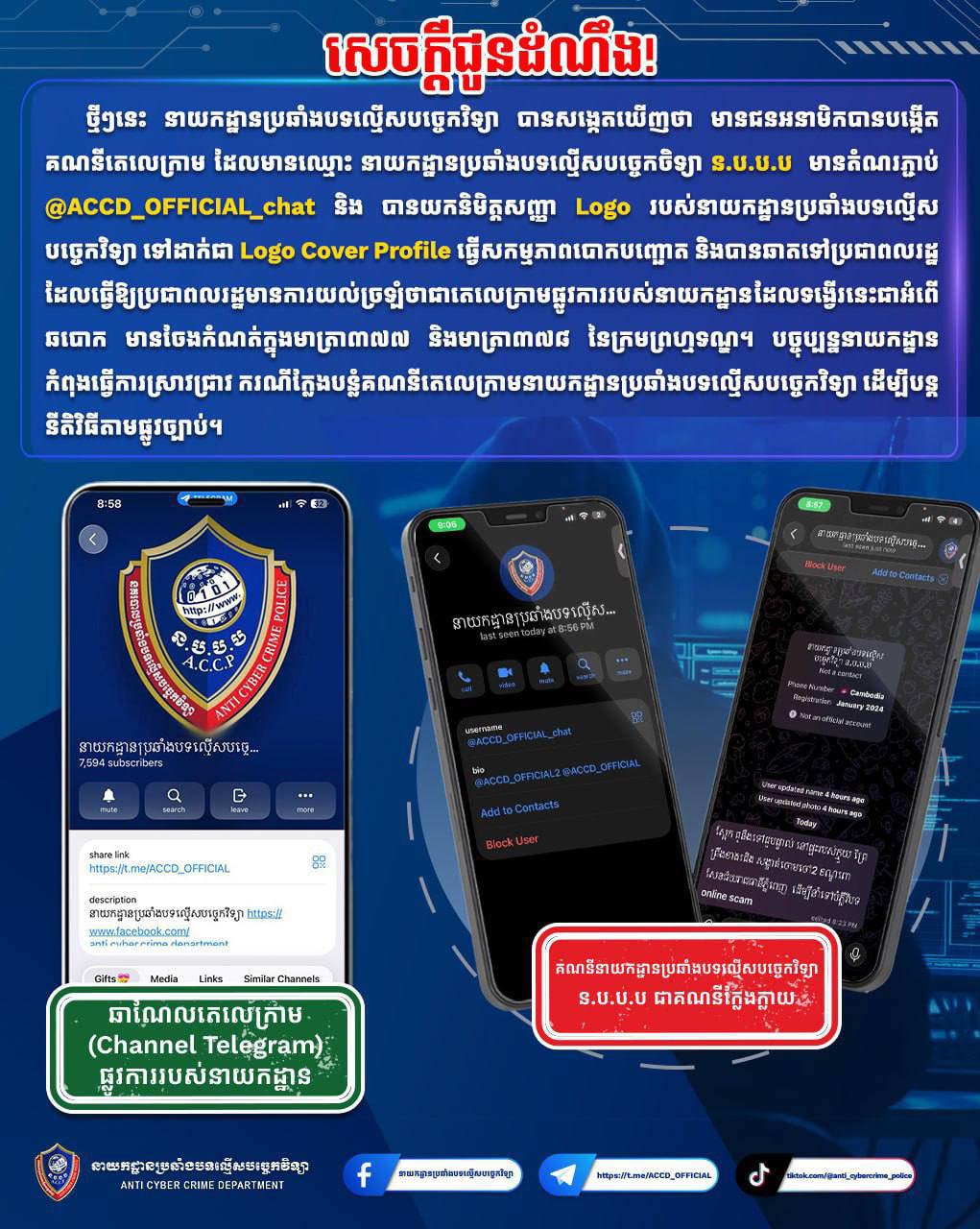 (ភ្នំពេញ)៖ នាយកដ្ឋានប្រឆាំងបទល្មើសបច្ចេកវិទ្យា ចេញសេចក្តីជូនដំណឹងស្តីពីករណី មានជនអនាមិក បានបង្កើតគណនីតេលេក្រាម ដែលមានឈ្មោះ នាយកដ្ឋានប្រឆាំងបទល្មើសបច្ចេកវិទ្យា ន.ប.ប.ប មានតំណរភ្ជាប់ @ACCD_OFFICIAL_chat និង បានយកនិមិត្តសញ្ញា Logo របស់នាយកដ្ឋានប្រឆាំងបទល្មើសបច្ចេកវិទ្យា ទៅដាក់ជា Logo Cover Profile ធ្វើសកម្មភាពបោកបញ្ឆោត និងបានឆាតទៅប្រជាពលរដ្ឋ សូមប្រជាពលរដ្ឋបង្កើនការប្រុងប្រយ័ត្ន។