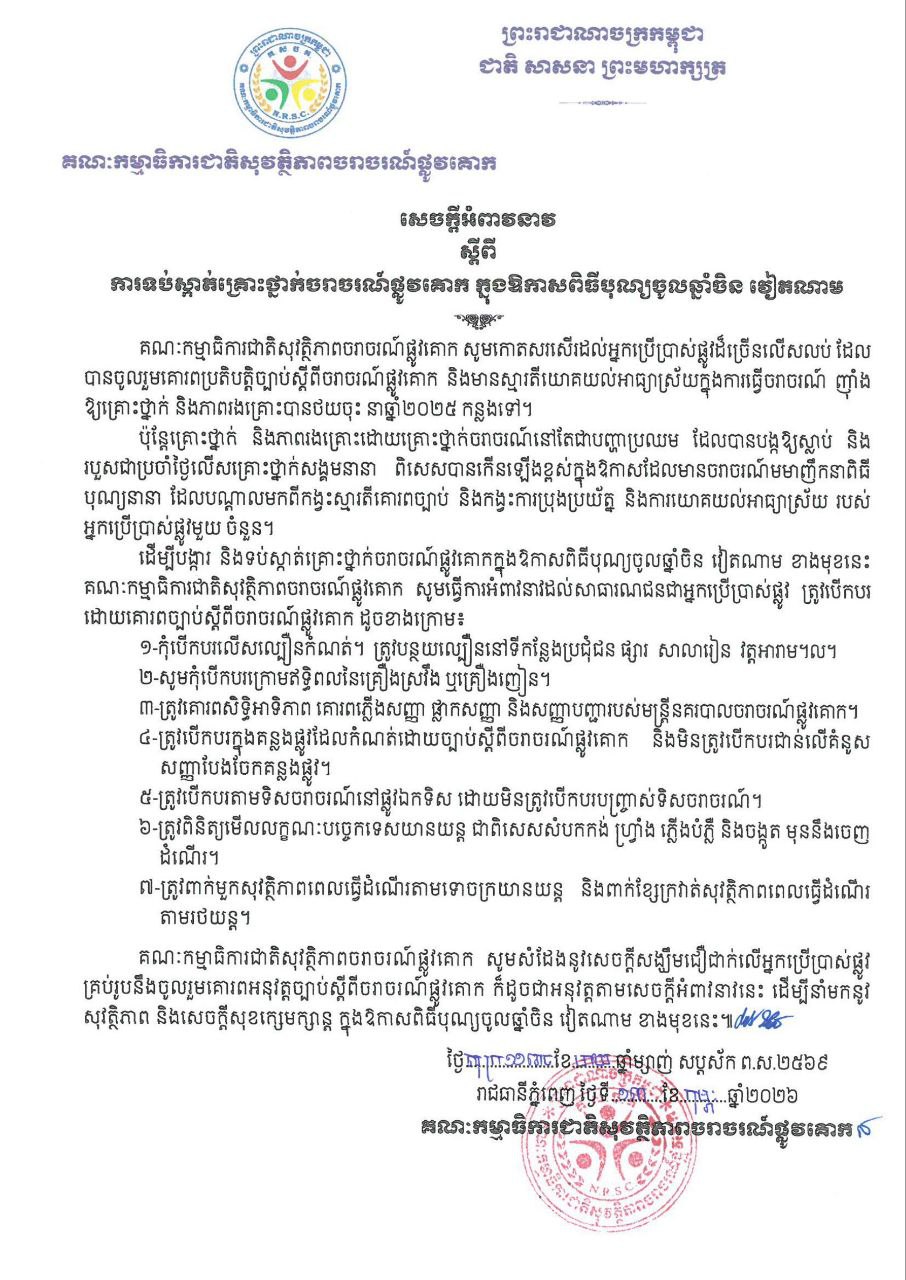 (ភ្នំពេញ)៖ គណៈកម្មាធិការជាតិសុវត្ថិភាពចរាចរណ៍ផ្លូវគោក នៅថ្ងៃទី១៣ ខែកុម្ភៈ ឆ្នាំ២០២៦នេះ បានចេញសេចក្តីអំពាវនាវដល់អ្នកប្រើប្រាស់ផ្លូវ រួមគ្នាទប់ស្កាត់គ្រោះថ្នាក់ចរាចរណ៍ផ្លូវគោក ក្នុងឱកាសពិធីបុណ្យចូលឆ្នាំចិន វៀតណាម។
