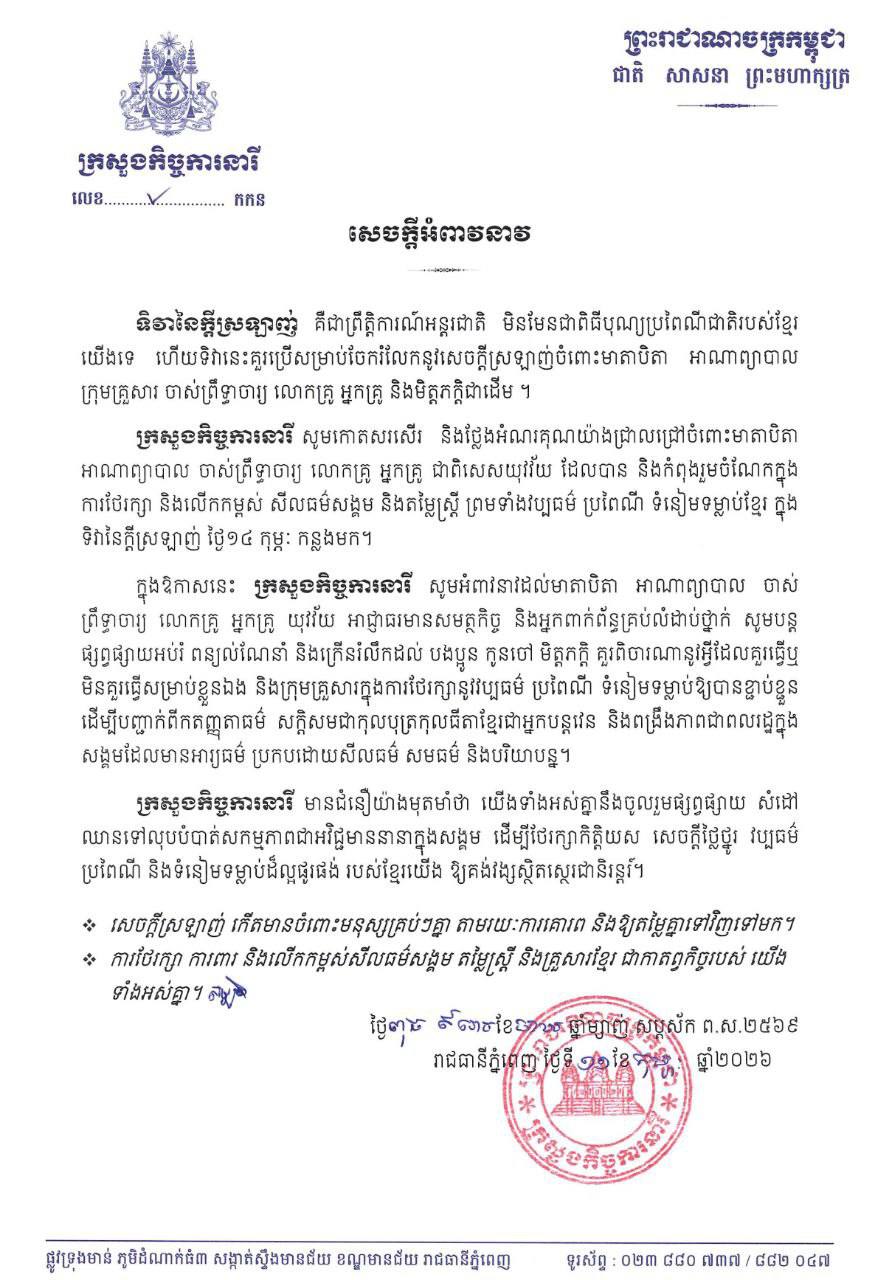 ក្រសួងកិច្ចការនារី សូមកោតសរសើរ និងថ្លែងអំណរគុណយ៉ាងជ្រាលជ្រៅចំពោះមាតាបិតា អាណាព្យាបាល ចាស់ព្រឹទ្ធាចារ្យ លោកគ្រូ អ្នកគ្រូ ជាពិសេសយុវវ័យ ដែលបាន និងកំពុងរួមចំណែកក្នុង ការថែរក្សា និងលើកកម្ពស់ សីលធម៌សង្គម និងតម្លៃស្ត្រី ព្រមទាំងវប្បធម៌ ប្រពៃណី ទំនៀមទម្លាប់ខ្មែរ ក្នុង ទិវានៃក្តីស្រឡាញ់ ថ្ងៃ១៤ កុម្ភៈ កន្លងមក។