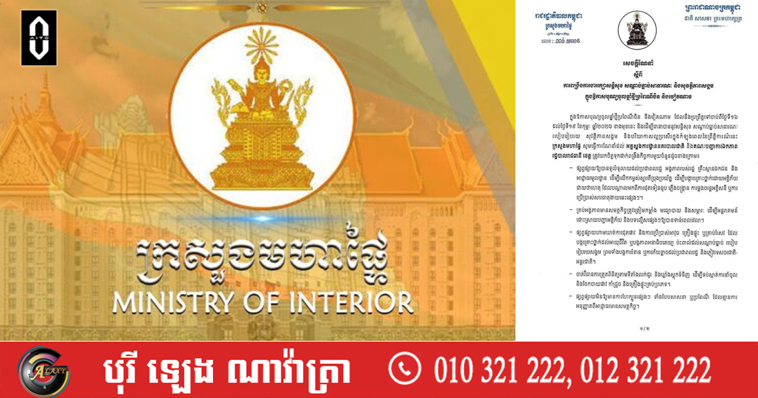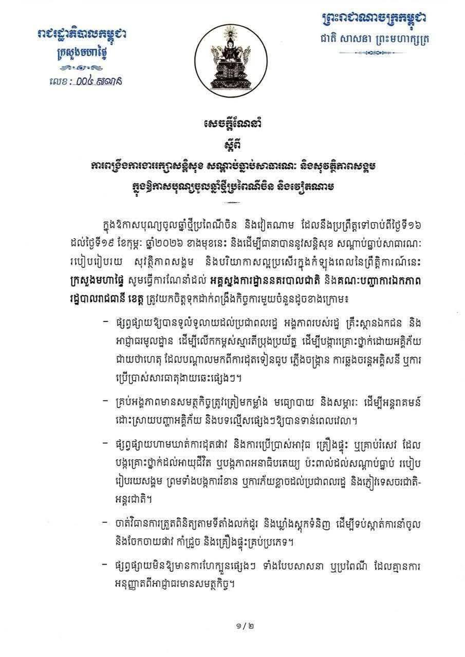 (ភ្នំពេញ)៖ ក្រសួងមហាផ្ទៃ នៅថ្ងៃទី១៣ ខែកុម្ភៈ ឆ្នាំ២០២៦នេះ បានចេញសេចក្ដីណែនាំស្ដីពីការពង្រឹងការងារសន្ដិសុខ សណ្ដាប់ធ្នាប់ និងសុវត្ថិភាពសង្គម ក្នុងឱកាសពិធីបុណ្យចូលឆ្នាំថ្មីប្រពៃណីចិន និងវៀតណាម ចាប់ពីថ្ងៃទី១៦ ដល់ថ្ងៃទី១៩ ខែកុម្ភៈ ឆ្នាំ២០២៦ខាងមុខ។