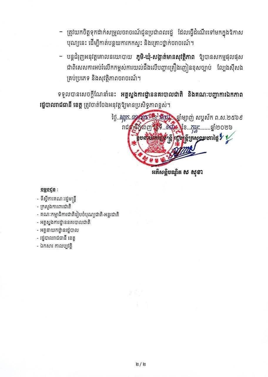 * ត្រូវយកចិត្តទុកដាក់សម្រួលចរាចរណ៍ជូនប្រជាពលរដ្ឋដែលធ្វើដំណើរទៅមកក្នុងឱកាស បុណ្យនេះ ដើម្បីកាត់បន្ថយការកកស្ទះ និងគ្រោះថ្នាក់ចរាចរណ៍
