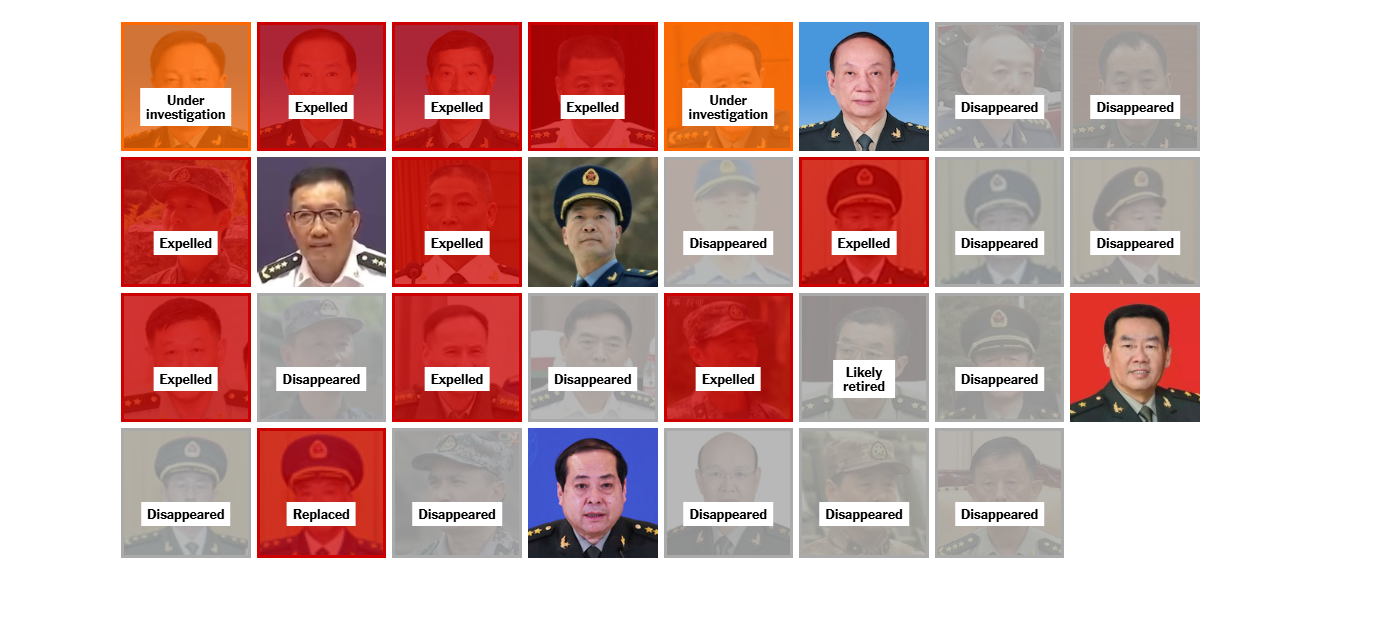 លោក ស៊ី ជីនពីង ក៏បានបណ្ដេញមន្ត្រីយោធាជាន់ខ្ពស់ជាច្រើនសិបនាក់ផ្សេងទៀតចេញពីតំណែងដែរ ក្នុងពេល៣ឆ្នាំចុងក្រោយនេះជាកម្រិតមួយខ្ពស់មិនធ្លាប់មានក្នុងប្រវត្តិសាស្ត្រចិនសម័យទំនើប។ ចិនមាន ឧត្តមសេនីយ៍ និងឧត្តមនាវីយ៉ាងហោច ៣០នាក់ គិតត្រឹមដើមឆ្នាំ២០២៣ ហើយពួកគេដឹកនាំអង្គភាពជំនាញផ្សេងៗគ្នានៃក្រសួងការពារជាតិ និងទីបញ្ជាការតាមភូមិភាគនីមួយៗ។ ពួកគេស្ទើរតែទាំងអស់ត្រូវបាន បណ្ដេញចេញពីតំណែង ឬបាត់ខ្លួនយ៉ាងអាថ៌កំបាំងអំឡុងយុទ្ធនាការបោសសម្អាតផ្ទៃក្នុងយោធាចិនរបស់លោក ស៊ី ជីនពីង។ នៅក្នុងករណីខ្លះ លោក ស៊ី ជីនពីង បានតែងតាំងឧត្តមសេនីយ៍ថ្មី តែពួកគេភាគច្រើន ក៏បានបាត់ខ្លួនពី ទីសាធារណៈផងដែរ។ តាមកាសែតអាមេរិក New York Times នៅមានឧត្តមសេនីយ៍ចិន៧នាក់ប៉ុណ្ណោះដែលកំពុងបន្តកាន់តំណែងយ៉ាងសកម្ម។