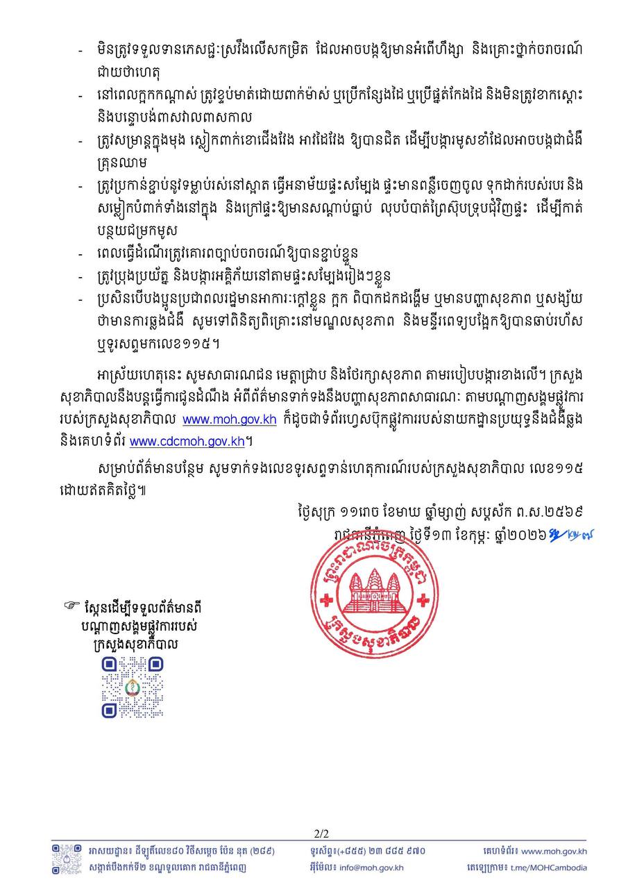 (ភ្នំពេញ)៖ ក្រសួងសុខាភិបាល នៅព្រឹកថ្ងៃទី១៤ ខែកុម្ភៈ ឆ្នាំ២០២៦នេះ បានចេញសេចក្តីប្រកាសព័ត៌មាន ស្តីពីវិធានការការពារ និងរក្សាសុខភាព ក្នុងឱកាសបុណ្យចូលឆ្នាំថ្មីប្រពៃណីចិន និងវៀតណាម។