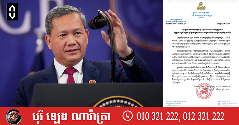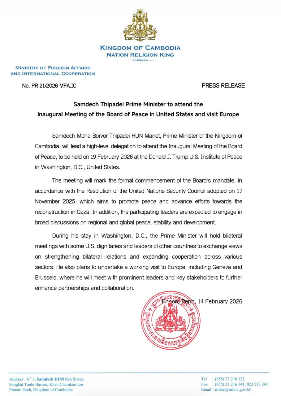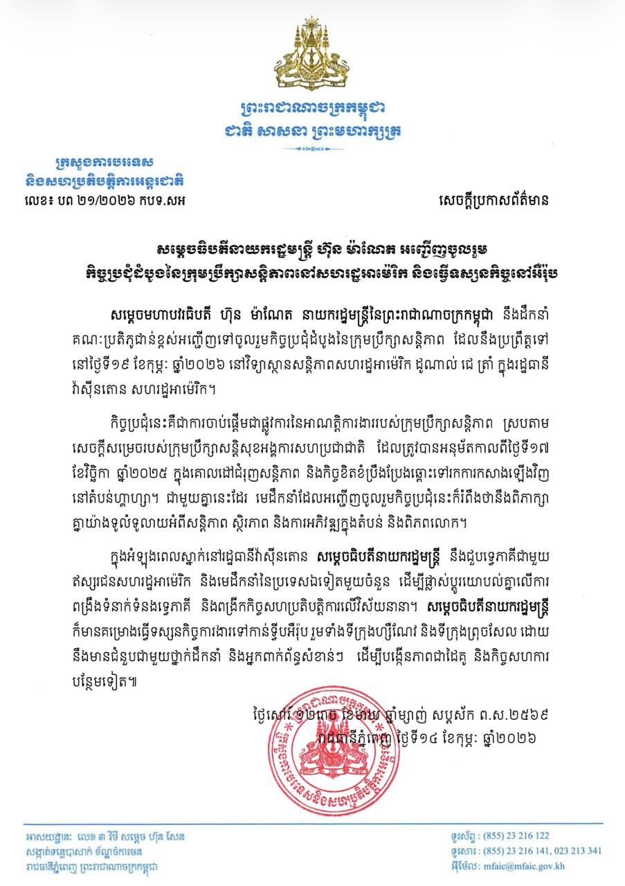 (ភ្នំពេញ)៖ សម្តេចមហាបវរធិបតី ហ៊ុន ម៉ាណែត នាយករដ្ឋមន្ត្រីនៃកម្ពុជា នឹងដឹកនាំ គណៈប្រតិភូជាន់ខ្ពស់អញ្ជើញទៅចូលរួមកិច្ចប្រជុំដំបូងនៃក្រុមប្រឹក្សាសន្តិភាព ដែលនឹងប្រព្រឹត្តទៅ នៅថ្ងៃទី១៩ ខែកុម្ភៈ ឆ្នាំ២០២៦ នៅវិទ្យាស្ថានសន្តិភាពសហរដ្ឋអាម៉េរិក ដូណាល់ ជេ ត្រាំ ក្នុងរដ្ឋធានី វ៉ាស៊ីនតោន សហរដ្ឋអាម៉េរិក។ នេះបើយោងតាមសេចក្ដីប្រកាសព័ត៌មានរបស់ក្រសួងការបរទេស និងសហប្រតិបត្តិការអន្តរជាតិ។