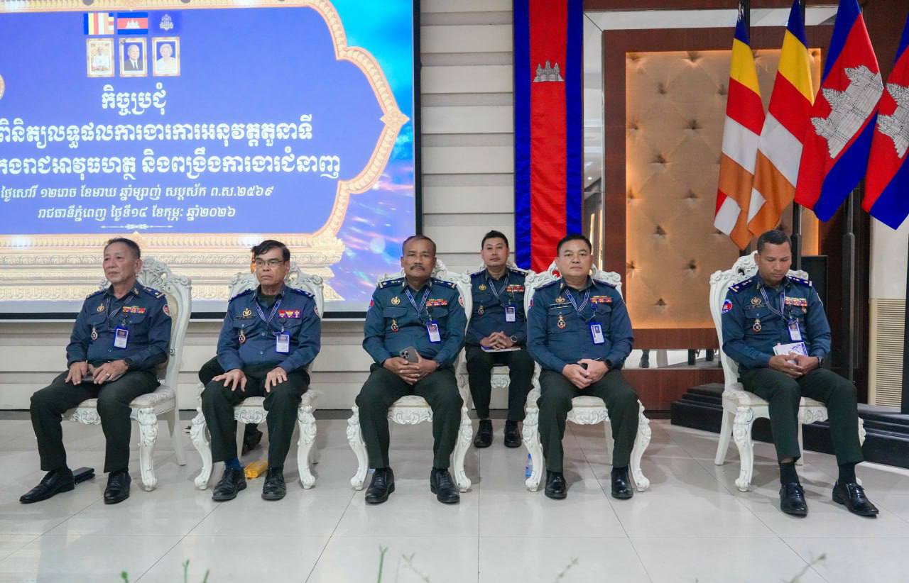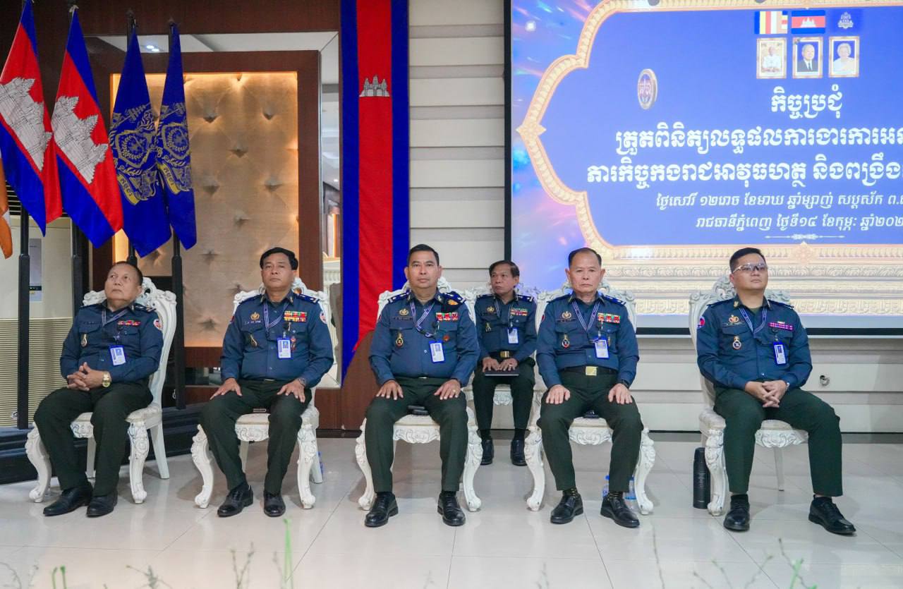 (ភ្នំពេញ)៖ លោកឧត្តមសេនីយ៍ឯក រ័ត្ន ស្រ៊ាង មេបញ្ជាការរង កងរាជអាវុធហត្ថលើផ្ទៃប្រទេស ជាមេបញ្ជាការកងរាជអាវុធហត្ថរាជធានីភ្នំពេញ នារសៀល ថ្ងៃទី១៤ ខែកុម្ភៈ ឆ្នាំ២០២៦ បានអញ្ជើញជាអធិបតីក្នុងកិច្ចប្រជុំត្រួតពិនិត្យលទ្ធផលការងារការអនុវត្តតួនាទី ភារកិច្ចកងរាជអាវុធហត្ថ និងពង្រឹងការងារជំនាញ និងត្រៀមបំពេញបេសកកម្មការពារសន្តិសុខ រក្សាសណ្តាប់ធ្នាប់ ក្នុងឱកាសបុណ្យចូលឆ្នាំចិន-វៀតណាម។