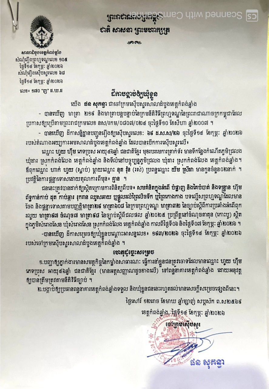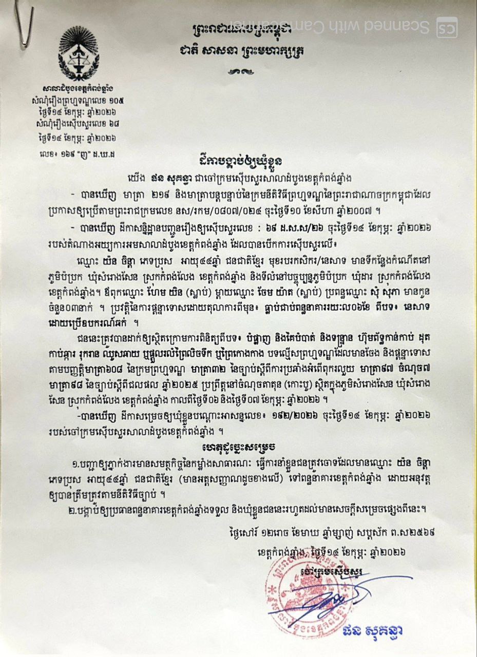 នៅរសៀលថ្ងៃទី១៤ ខែកុម្ភៈ ឆ្នាំ២០២៦ ជនសង្ស័យទាំង២នាក់ ត្រូវបានអង្គភាពប្រឆាំងអំពើពុករលួយ បញ្ជូនមកកាន់សាលាដំបូងខេត្តកំពង់ឆ្នាំងវិញ និងបានបញ្ជូនបន្តទៅកាន់ព័ន្ធនាគារខេត្តកំពង់ឆ្នាំង តាមដីកាបង្គាប់ឱ្យឃុំខ្លួនលេខ១៦៩ "ញ"ដ.ឃ.ដ ចុះថ្ងៃទី១៤ ខែកុម្ភៈ ឆ្នាំ២០២៦ របស់ចៅក្រមស៊ើបសួរសាលាដំបូងខេត្តកំពង់ឆ្នាំង។