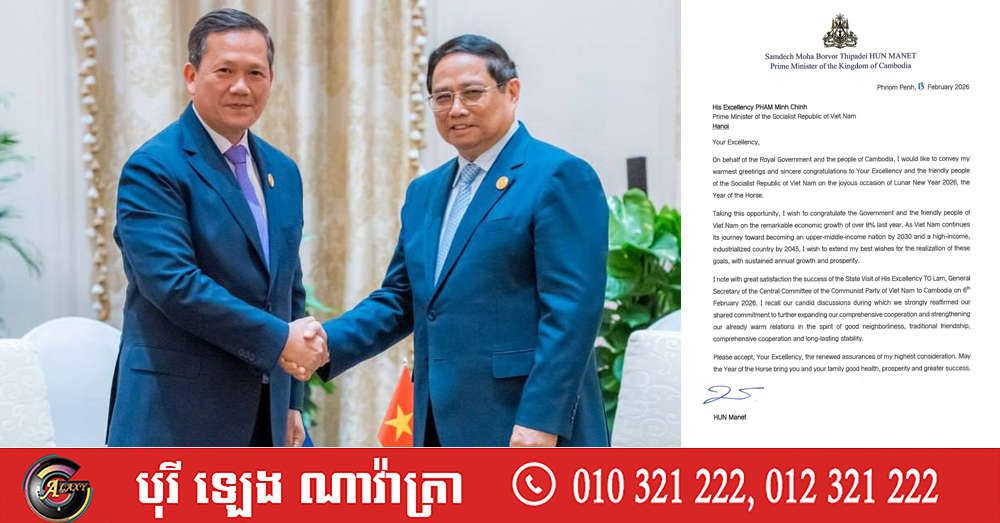 សម្តេចបវរធិបតី ហ៊ុន ម៉ាណែត ផ្ញើសារលិខិតជូនពរលោក ផាម មិញជីញ នាយករដ្ឋមន្ត្រីវៀតណាម ក្នុងឱកាសបុណ្យចូលឆ្នាំថ្មីប្រពៃណីវៀតណាម ឆ្នាំ២០២៦ (Video inside)