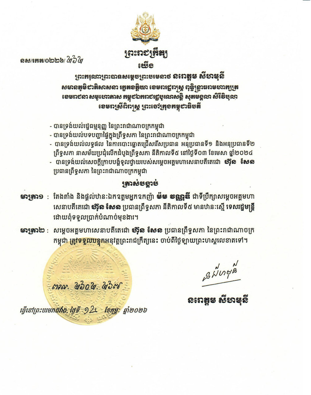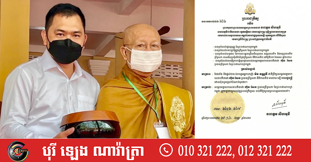 (ភ្នំពេញ)៖ សម្ដេចព្រះអភិសិរីសុគន្ធាមហាសង្ឃរាជាធិបតី កិត្តិឧទ្ទេសបណ្ឌិត បួរ គ្រី សម្ដេចព្រះមហាសង្ឃរាជ នៃគណៈធម្មយុត្តិកនិកាយ នៃព្រះរាជាណាចក្រកម្ពុជា បានប្រទានព្រះរាជសារអបអរសាទរជូនពរអ្នកឧកញ៉ា ម៉ម វណ្ណឌី អនុប្រធានសមាគមអតីតយុទ្ធជន និងនិវត្តជនកម្ពុជា ដែលត្រូវបានព្រះមហាក្សត្រ ត្រាស់បង្គាប់តែងតាំង និងផ្តល់ឋានៈជា ទីប្រឹក្សាសម្តេចតេជោ ហ៊ុន សែន ប្រធានព្រឹទ្ធសភា មានឋានៈស្មើ «ទេសរដ្ឋមន្ត្រី»៕