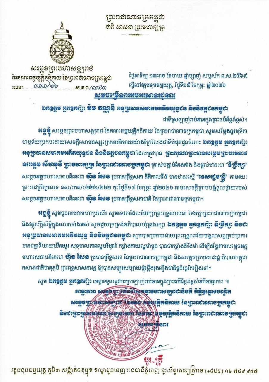 សម្ដេចព្រះមហាសង្ឃរាជ បួរ គ្រី ប្រទានព្រះរាជសារអបអរសាទរជូនពរ អ្នកឧកញ៉ា ម៉ម វណ្ណឌី ដែលត្រូវបានព្រះមហាក្សត្រ ត្រាស់បង្គាប់តែងតាំង និងផ្តល់ឋានៈជា ទីប្រឹក្សា សម្តេចតេជោ ហ៊ុន សែន ប្រធានព្រឹទ្ធសភា