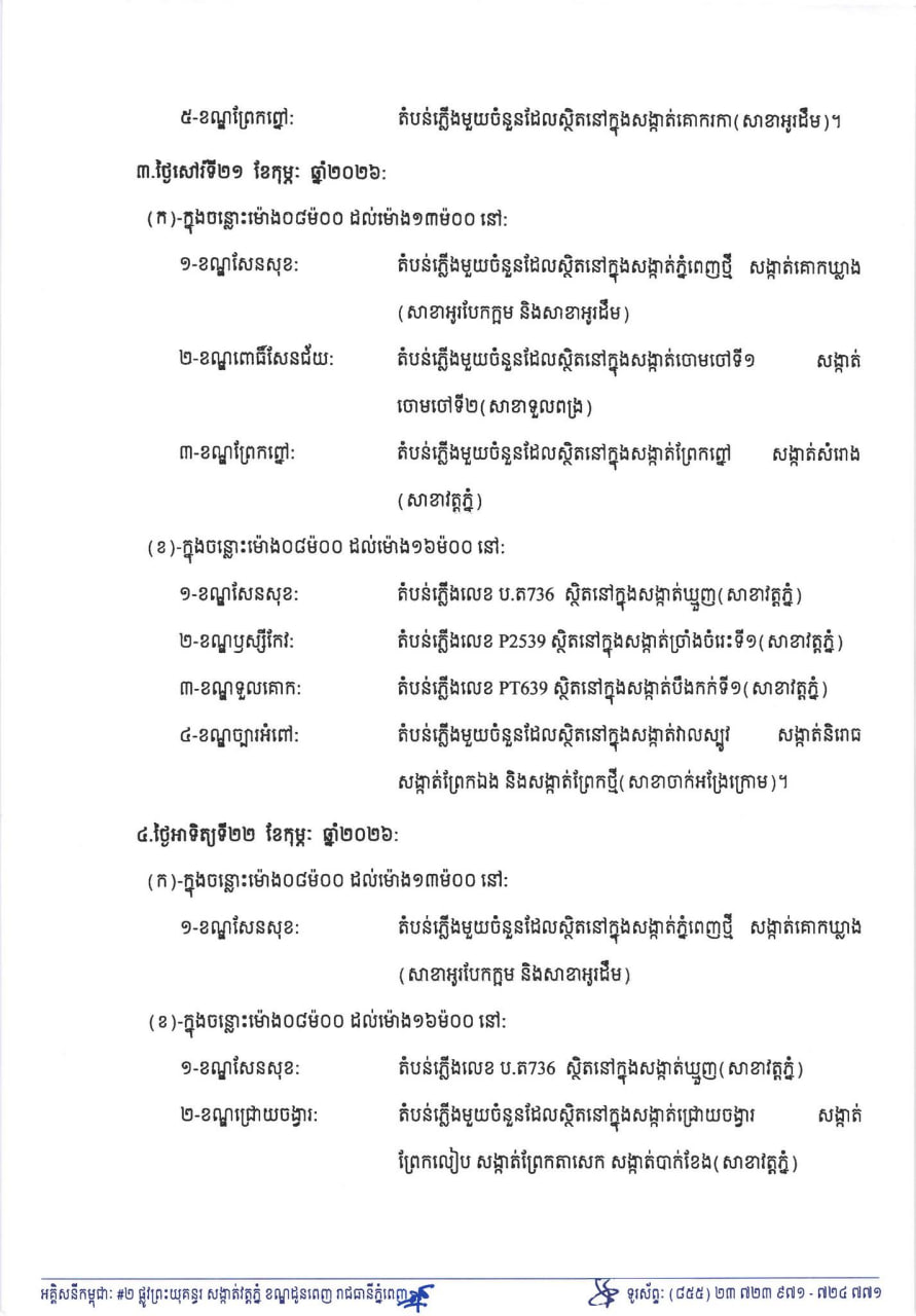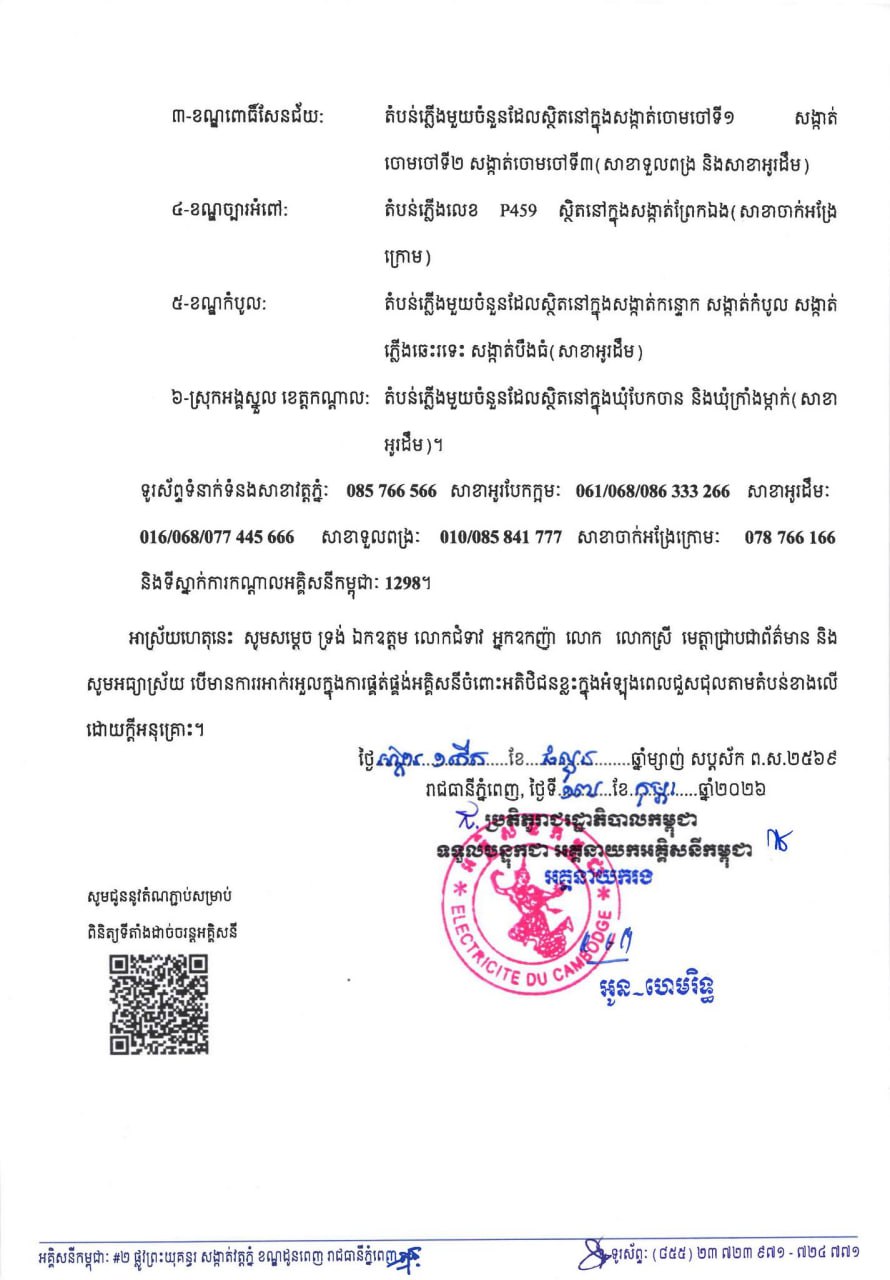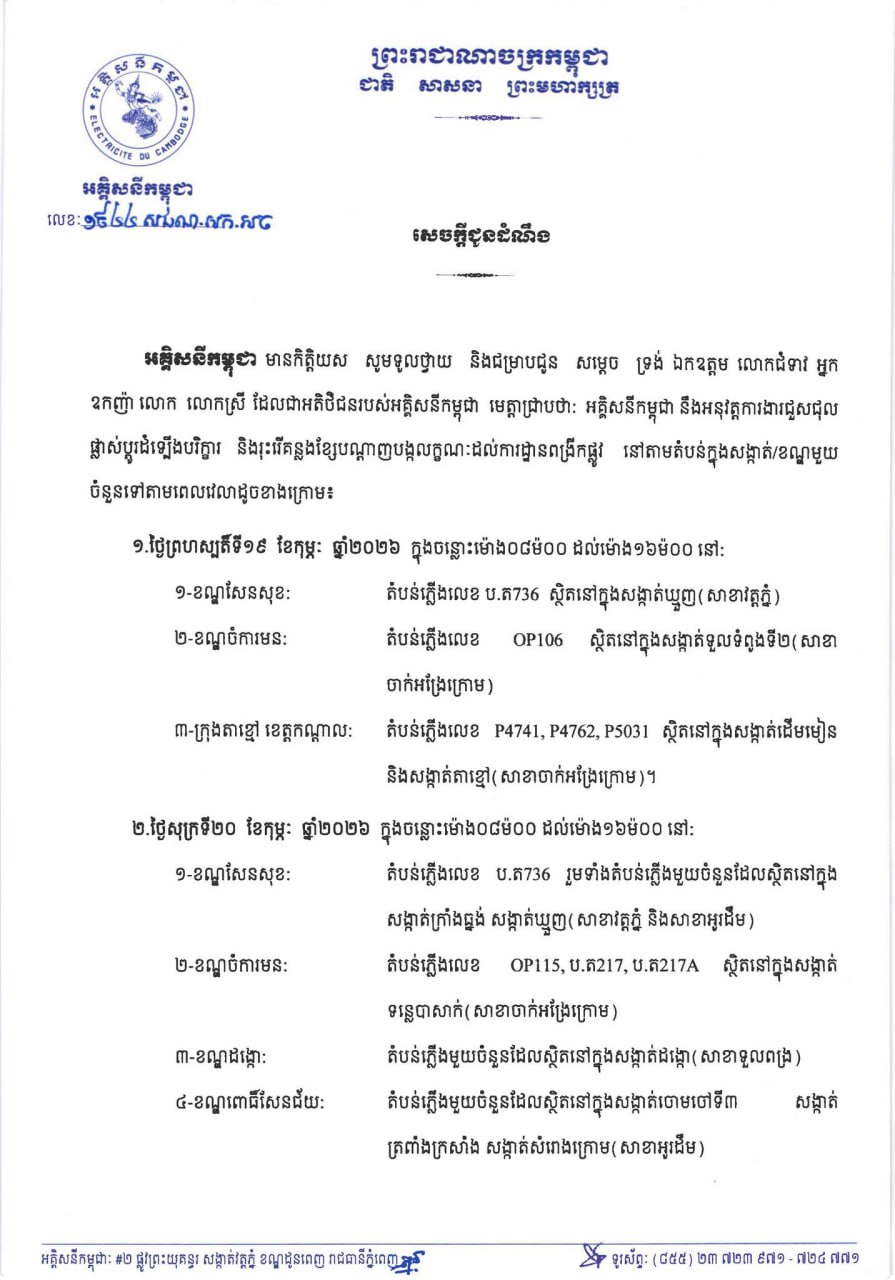 (ភ្នំពេញ)៖ អគ្គិសនីកម្ពុជា(EDC) បានចេញសេចក្តីជូនដំណឹងស្តីពីការអនុវត្តការងារជួសជុល ផ្លាស់ប្តូរដំឡើងបរិក្ខារនានា និងរុះរើគន្លងខ្សែបណ្តាញ អគ្គិសនីរបស់អគ្គិសនីកម្ពុជា ដើម្បីបង្កលក្ខណៈងាយស្រួលដល់ការដ្ឋានពង្រីកផ្លូវ នៅថ្ងៃទី១៩ ខែកុម្ភៈ ឆ្នាំ២០២៦ ដល់ថ្ងៃទី២២ ខែកុម្ភៈ ឆ្នាំ២០២៦ នៅតំបន់មួយចំនួនទៅតាមពេលវេលា និងទីកន្លែងដូចសេចក្តីជូនដំណឹងលម្អិតខាងក្រោម។