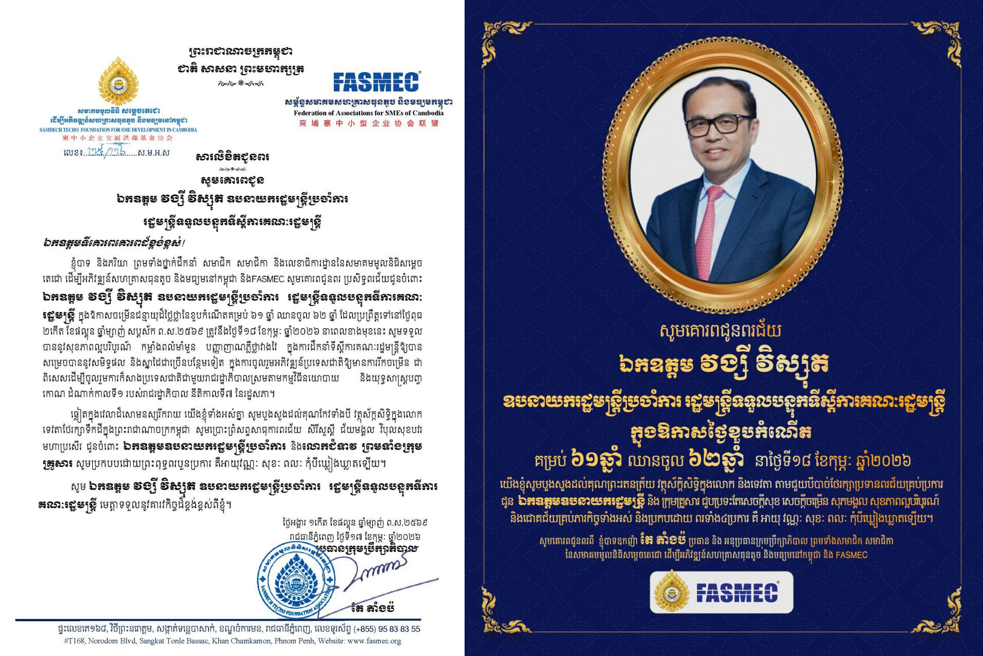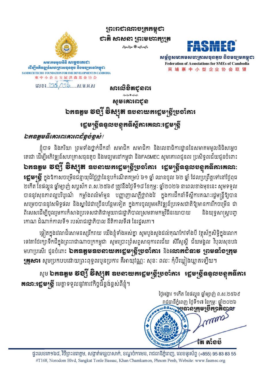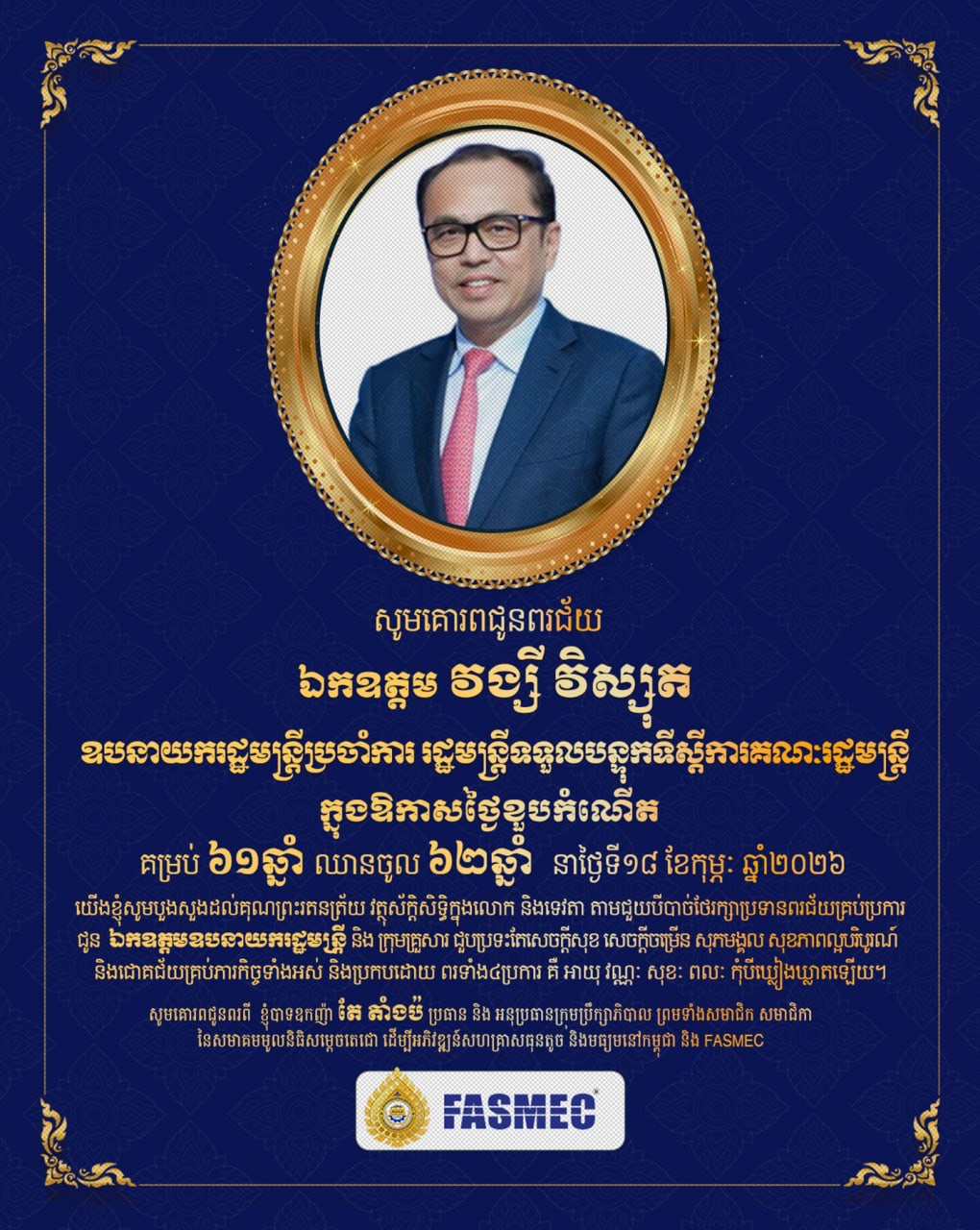 យើងខ្ញុំទាំងអស់គ្នា សូមគោរពសម្ដែងនូវសេចក្ដីសោមនស្សរីករាយ និងសូមអបអរសាទរយ៉ាងស្មោះស្ម័គ្រ ក្នុងឱកាសចម្រើនជន្មាយុរបស់ ឯកឧត្ដមឧបនាយករដ្ឋមន្ត្រីប្រចាំការ ដែលប្រព្រឹត្តទៅនាថ្ងៃពុធ ២កើត ខែផល្គុន ឆ្នាំម្សាញ់ សប្តស័ក ពុទ្ធសករាជ ២៥៦៩ ត្រូវនឹងថ្ងៃទី១៨ ខែកុម្ភៈ ឆ្នាំ២០២៦។