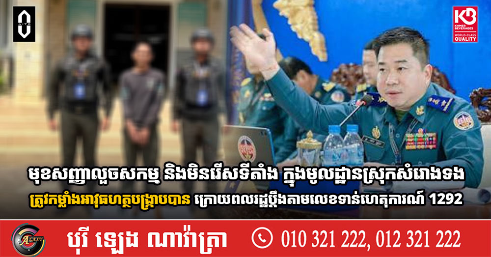 មុខសញ្ញាលួចសកម្ម និងមិនរើសទីតាំង ក្នុងមូលដ្ឋានស្រុកសំរោងទង ត្រូវកម្លាំងអាវុធហត្ថបង្ក្រាបបាន ក្រោយពលរដ្ឋប្ដឹងតាមលេខទាន់ហេតុការណ៍ 1292
