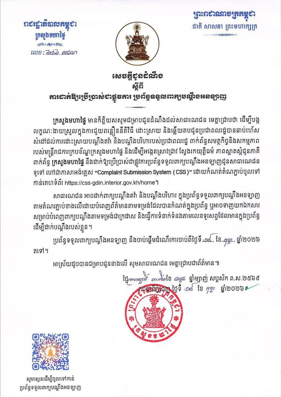 ក្រសួងមហាផ្ទៃ ប្រកាសដាក់ឱ្យប្រើប្រាស់ជាផ្លូវការ ប្រព័ន្ធទទួលពាក្យបណ្តឹងអនឡាញ ចាប់ពីថ្ងៃទី១៩ ខែកុម្ភៈនេះតទៅ