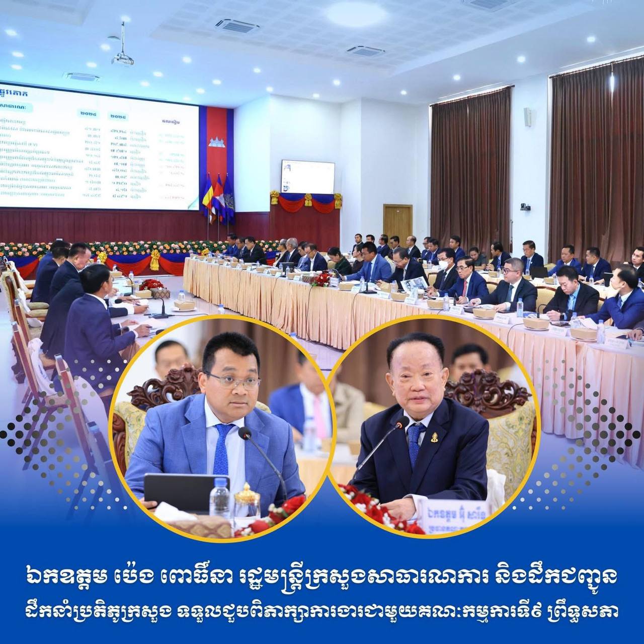 (ភ្នំពេញ)៖ លោក ប៉េង ពោធិ៍នា រដ្ឋមន្រ្តីក្រសួងសាធារណការ និងដឹកជញ្ជូន នាព្រឹកថ្ងៃទី១៩ ខែកុម្ភៈ ឆ្នាំ២០២៦នេះ បានដឹកនាំប្រតិភូក្រសួង ទទួលជួបពិភាក្សាការងារជាមួយប្រតិភូគណៈកម្មការសាធារណការ ដឹកជញ្ជូន អាកាសចរណ៍ស៊ីវិល ប្រៃសណីយ៍ ទូរគមនាគមន៍ ឧស្សាហកម្ម វិទ្យាសាស្ត្រ បច្ចេកវិទ្យា នវានុវត្តន៍ រ៉ែ ថាមពល ពាណិជ្ជកម្ម រៀបចំដែនដី នគរូបនីយកម្ម និងសំណង់ (គណៈកម្មការទី៩) ព្រឹទ្ធសភា ដែលដឹកនាំដោយលោក អ៊ុំ សារឹទ្ធ ប្រធានគណៈកម្មការ។