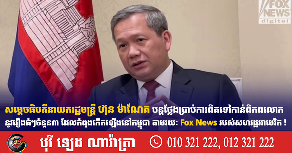 TOP NEWS: សម្តេចធិបតីនាយករដ្ឋមន្រ្តី ហ៊ុន ម៉ាណែត បន្តថ្លែងប្រាប់ការពិតទៅកាន់ពិភពលោកនូវរឿងធំៗចំនួន៣ ដែលកំពុងកើតឡើងនៅកម្ពុជា តាមរយៈបណ្តាញព័ត៌មាន Fox News របស់សហរដ្ឋអាមេរិក ! (Video inside)