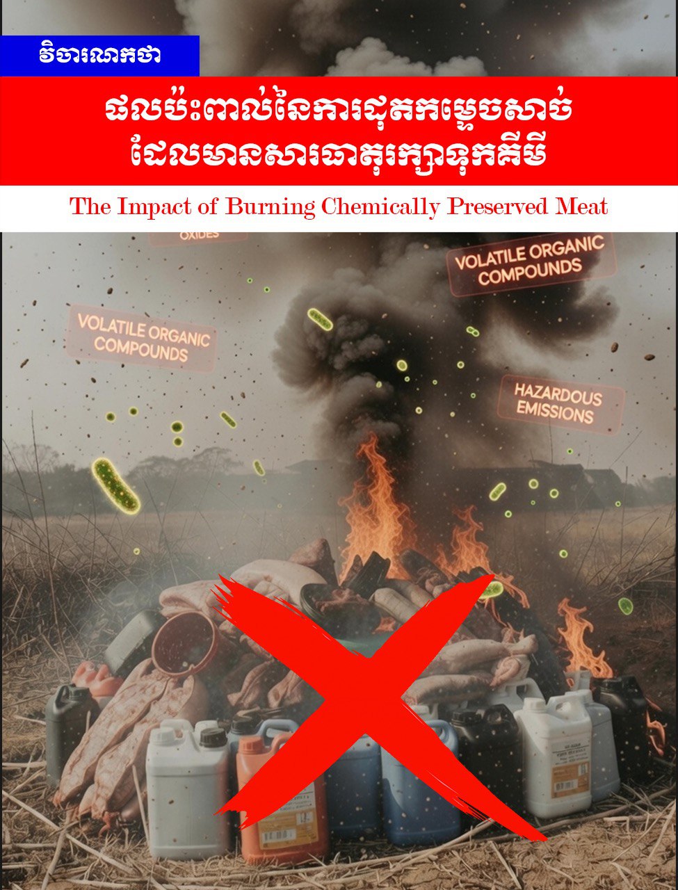 (ភ្នំពេញ)៖ ការដុតបំផ្លាញសាច់ដែលមានផ្ទុកសារធាតុរក្សាទុកគីមី បង្កជាកង្វល់ដល់បរិស្ថាន និងសុខភាពសាធារណៈខ្លាំងជាងការដុតសំណល់សរីរាង្គទូទៅ។ ជាធម្មតា សាច់ដែលត្រូវបានរក្សាទុកដោយគីមី តែងមានផ្ទុកនូវសារធាតុរក្សាគុណភាព សារធាតុបន្ទន់សាច់ ឬសារធាតុបន្ថែមផ្សេងៗដើម្បីពន្យារកាលបរិច្ឆេទប្រើប្រាស់។