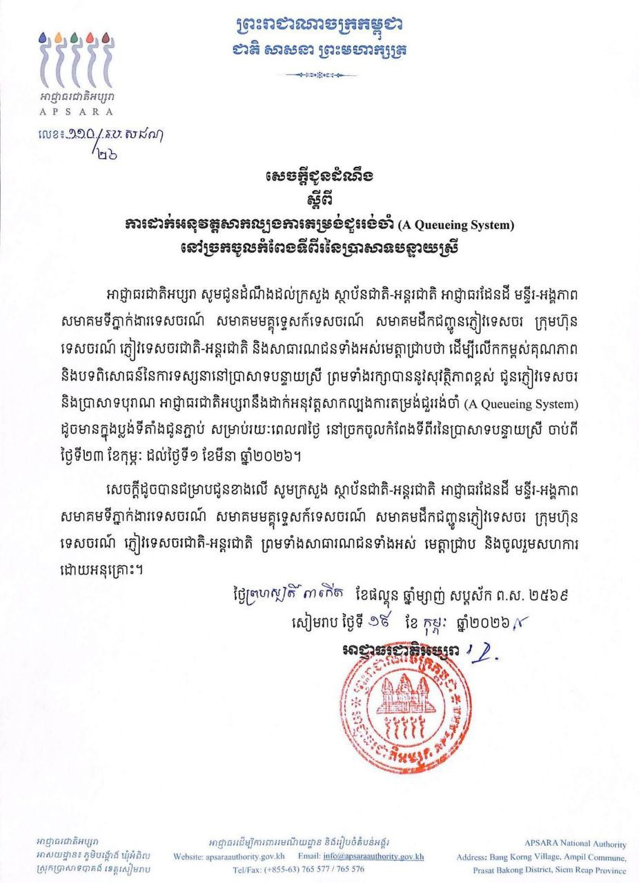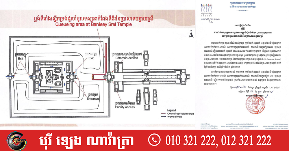 (សៀមរាប)៖ ដើម្បីលើកកម្ពស់គុណភាព និងបទពិសោធន៍ នៃការទស្សនានៅប្រាសាទបន្ទាយស្រី ព្រមទាំងរក្សាបាននូវសុវត្ថិភាពខ្ពស់ ជូនភ្ញៀវទេសចរ និងប្រាសាទបុរាណ អាជ្ញាធរជាតិអប្សរា នឹងដាក់អនុវត្តសាកល្បងការតម្រង់ជួររង់ចាំ (A Queueing System) ដូចមានក្នុងប្លង់ទីតាំងជូនភ្ជាប់ សម្រាប់រយៈពេល៧ថ្ងៃ នៅច្រកចូលកំពែងទីពីរ នៃប្រាសាទបន្ទាយស្រី ចាប់ពីថ្ងៃទី២៣ ខែកុម្ភៈ ដល់ថ្ងៃទី១ ខែមីនា ឆ្នាំ២០២៦។