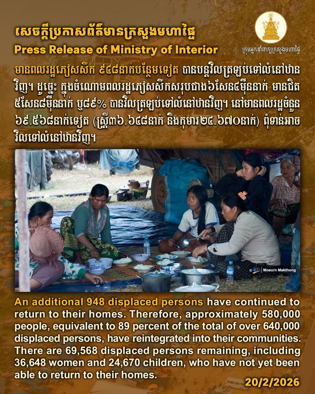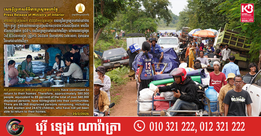 (ភ្នំពេញ)៖ ក្រសួងមហាផ្ទៃ នៅថ្ងៃទី២០ ខែកុម្ភៈ ឆ្នាំ២០២៦នេះ បានឲ្យដឹងថា គិតចាប់ពីម៉ោង៦ព្រឹក ថ្ងៃទី១៩ ដល់ម៉ោង៦ព្រឹក ថ្ងៃទី២០ ខែកុម្ភៈ ឆ្នាំ២០២៦នេះ មានប្រជាពលរដ្ឋភៀសសឹក ៩៤៨នាក់បន្ថែមទៀត បានវិលត្រឡប់ទៅលំនៅឋានវិញ។ ដូច្នេះក្នុងចំណោមពលរដ្ឋភៀសសឹកសរុបជាង៦សែន៤ម៉ឺននាក់ មានជិត៥សែន ៨ម៉ឺននាក់ ស្មើប្រមាណ៨៩ភាគរយ បានវិលត្រឡប់ទៅលំនៅឋានវិញ។