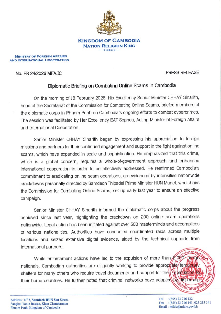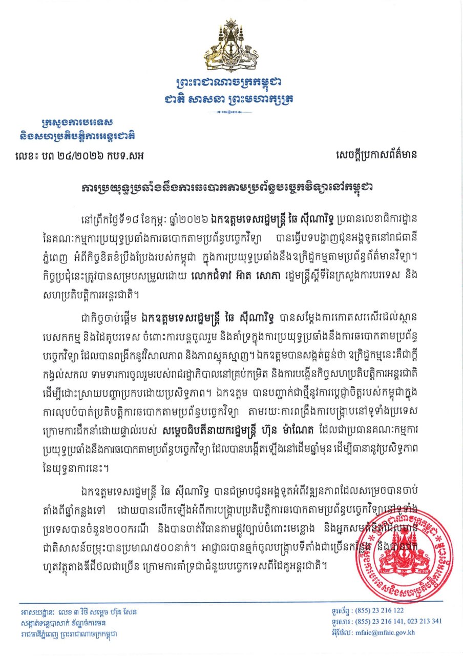 គួររំលឹកថា កាលពីថ្ងៃទី១៨ ខែកុម្ភៈ ឆ្នាំ២០២៦ លោកទេសរដ្ឋមន្ត្រី ឆៃ ស៊ីណារិទ្ធ ប្រធានលេខាធិការដ្ឋាន នៃគណៈកម្មការប្រយុទ្ធប្រឆាំងការឆបោកតាមប្រព័ន្ធបច្ចេកវិទ្យា បានធ្វើបទបង្ហាញជូនអង្គទូតនៅរាជធានីភ្នំពេញ អំពីកិច្ចខិតខំប្រឹងប្រែងរបស់កម្ពុជា ក្នុងការប្រយុទ្ធប្រឆាំងនឹងឧក្រិដ្ឋកម្មតាមប្រព័ន្ធព័ត៌មានវិទ្យា។ កិច្ចប្រជុំនេះត្រូវបានសម្របសម្រួលដោយ លោកស្រី អ៊ាត សោភា រដ្ឋមន្ត្រីស្តីទីនៃក្រសួងការបរទេស និងសហប្រតិបត្តិការអន្តរជាតិ។