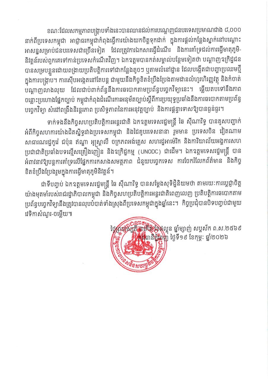 (ភ្នំពេញ)៖ ក្នុងប្រតិបត្តិការប្រឆាំងនឹងឧក្រិដ្ឋកម្មឆបោកតាមប្រព័ន្ធបច្ចេកវិទ្យា ខណៈជនបរទេសប្រមាណជាង ៨,០០០នាក់ ត្រូវបានបណ្ដេញចេញពីកម្ពុជា។ នេះបើយោងតាមសេចក្ដីប្រកាសព័ត៌មានស្ដីពី ការប្រយុទ្ធប្រឆាំងនឹងការឆបោកតាមប្រព័ន្ធបច្ចេកវិទ្យានៅកម្ពុជា របស់ក្រសួងការបរទេស និងសហប្រតិបត្តិការអន្តរជាតិ ចុះថ្ងៃទី១៩ ខែកុម្ភៈ ឆ្នាំ២០២៦។